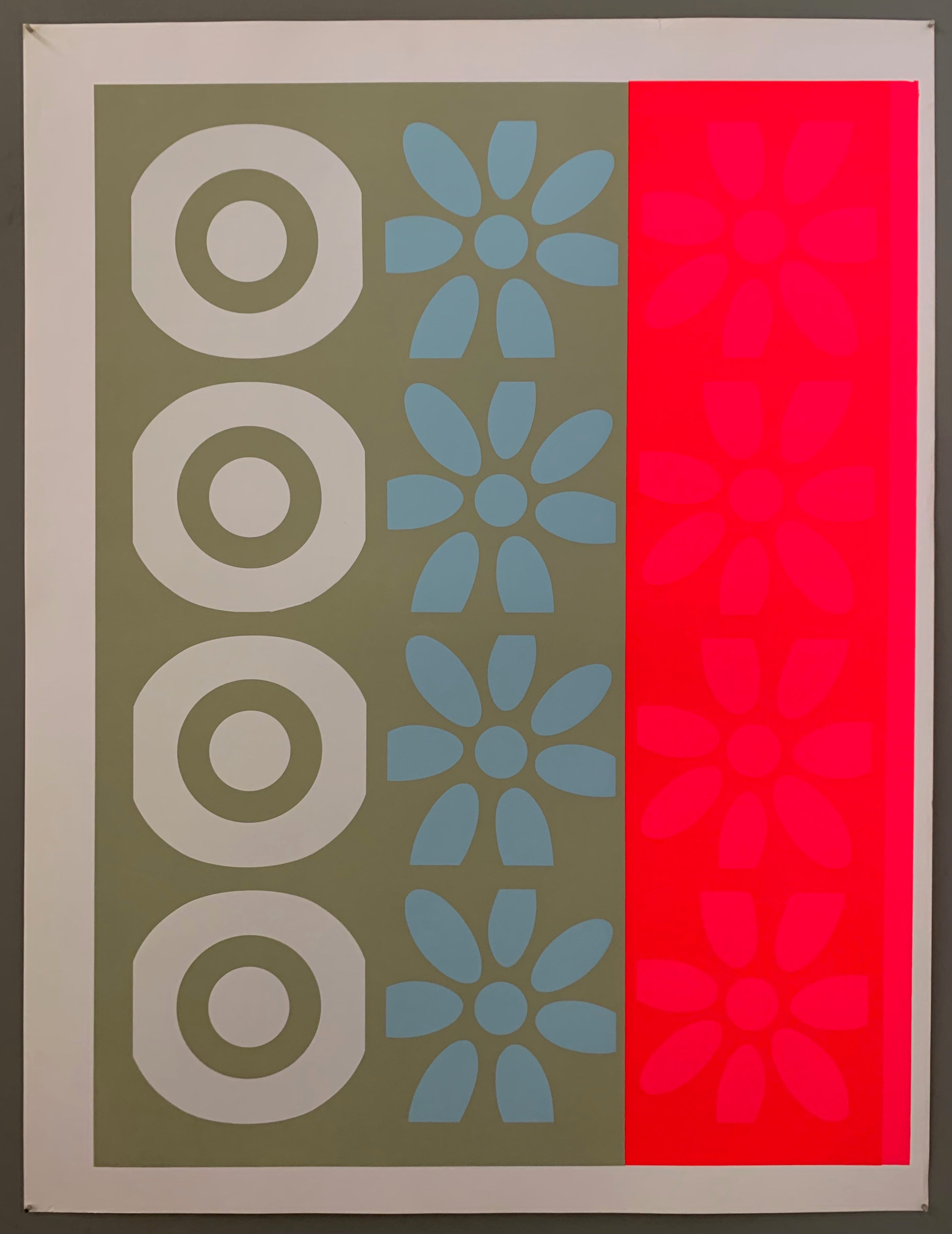 Original silkscreen print by artist Peter Gee showing a geometric pattern: on the left a green-gray panel with white targets and blue flowers on top. To the right of this is a neon pink panel with slightly lighter pink flowers on top—the difference in shade is subtle. This understated pattern and asymmetrical arrangement allows for a full exploration of color.