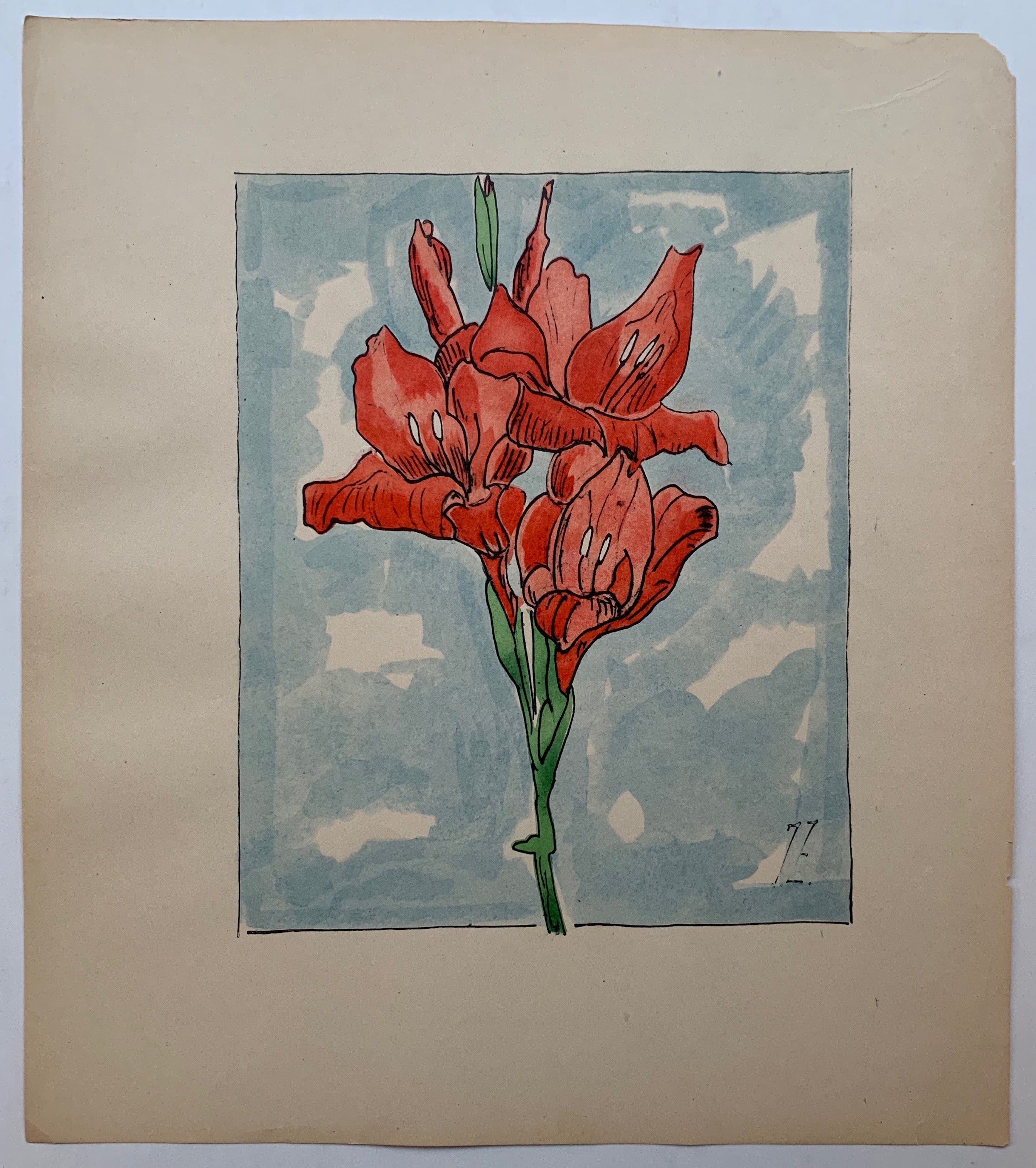A lovely pochoir of a red iris, sitting against a blue sky speckled with clouds and enclosed in a black border.