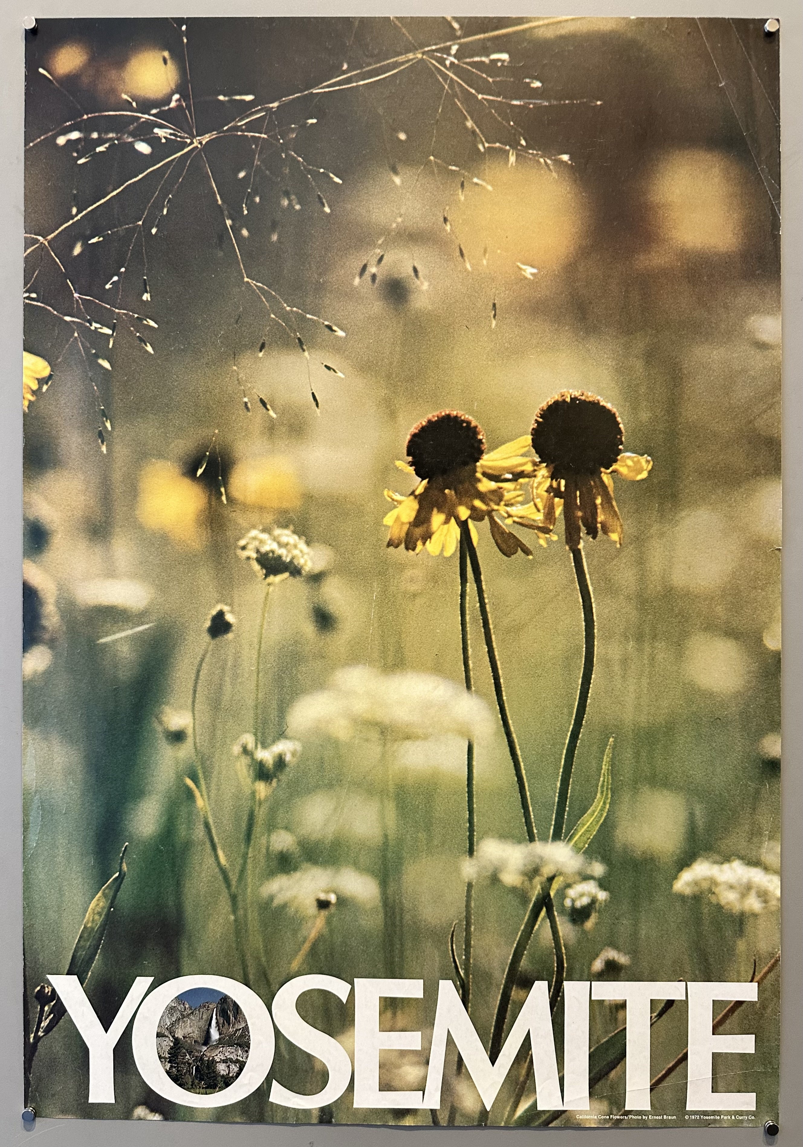 Poster from a series promoting travel to Yosemite National Park in California, featuring a photograph of California Cone Flowers.