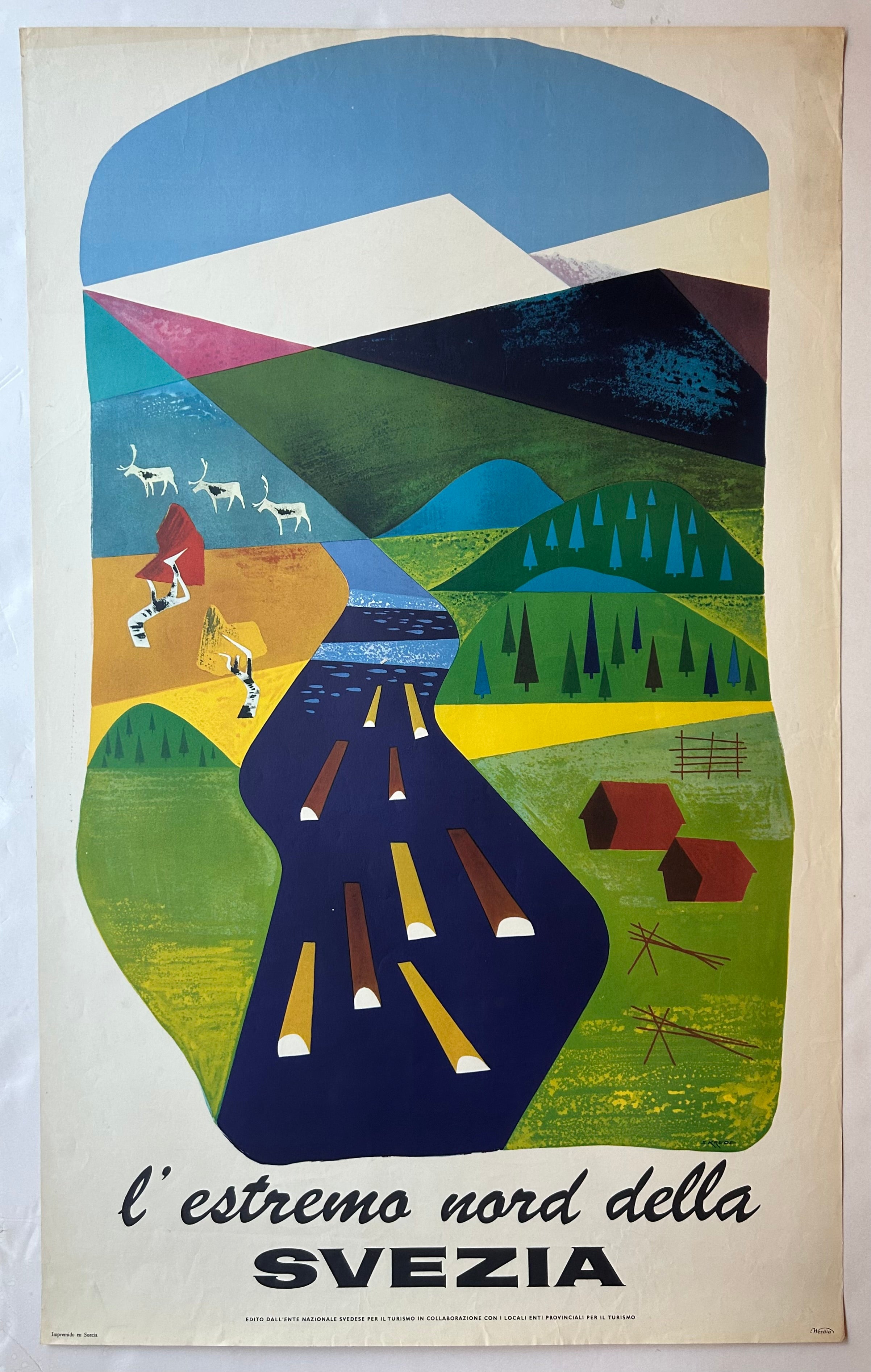 Colorful design in the Cubist style, highlights the natural beauty of Northern Sweden, including rolling hills, bubbling streams, and hoards of elk.