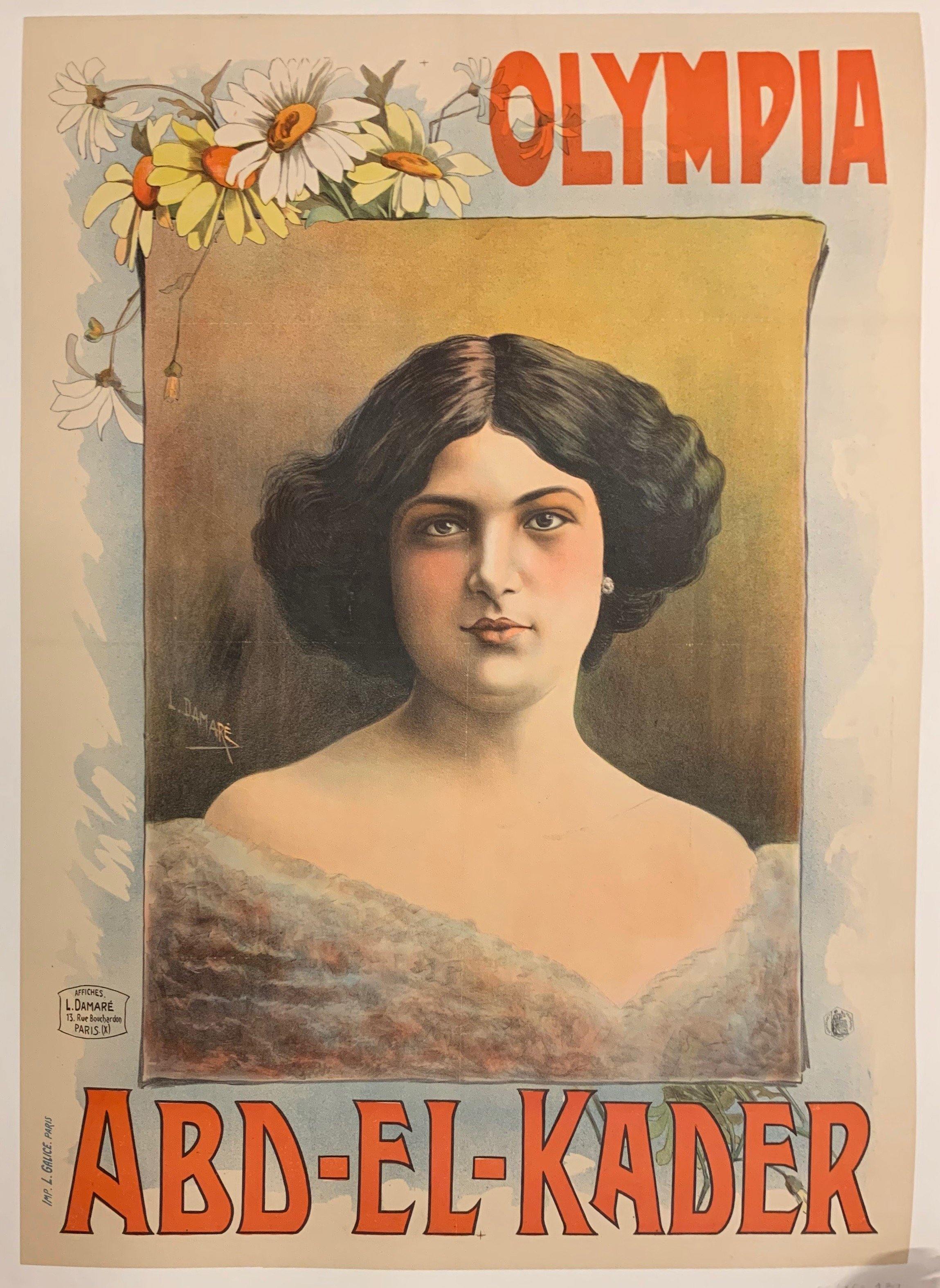 Vintage French poster from the turn of the century showing a dashing portrait of a young woman.