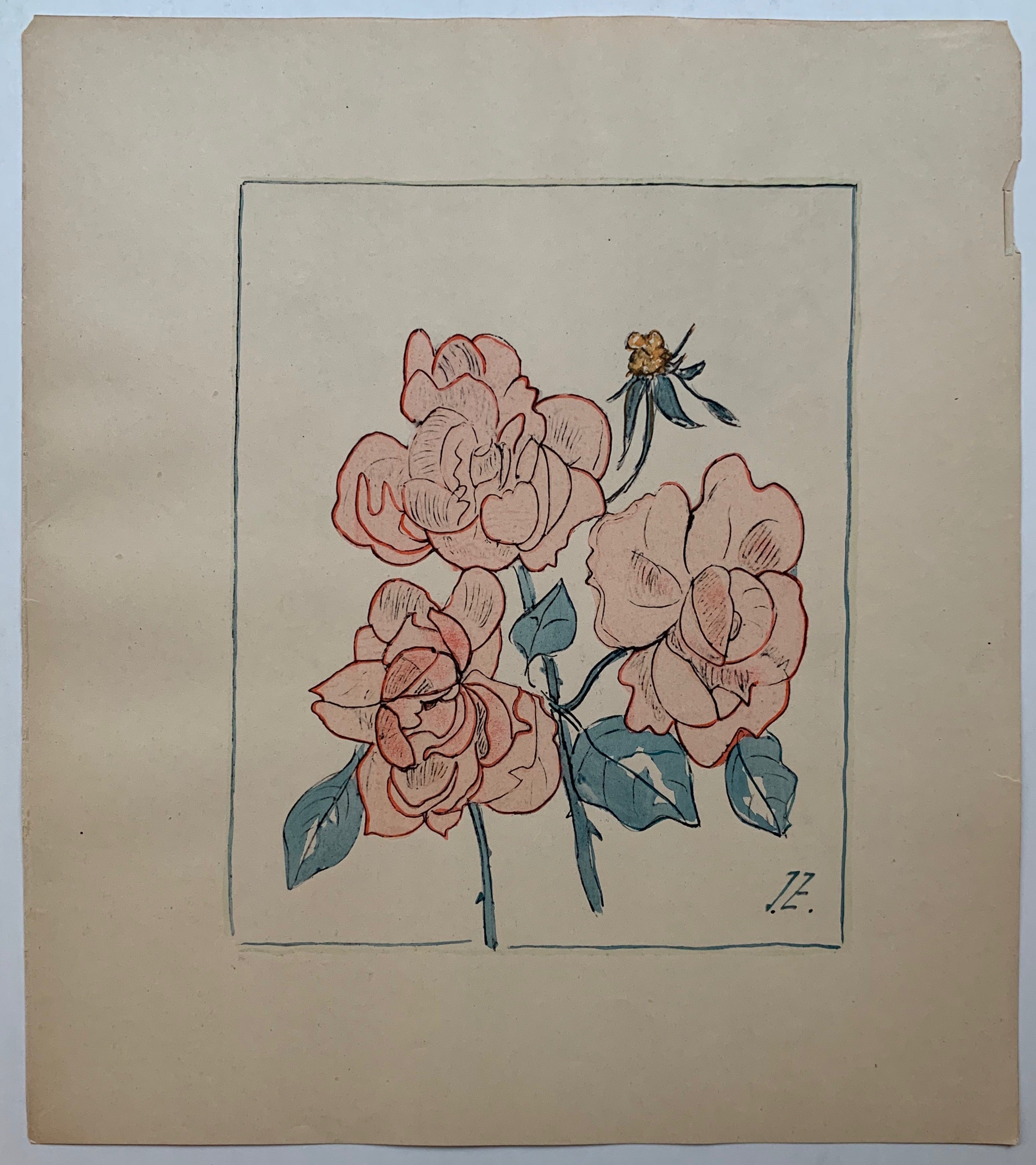 A lovely pochoir of a bouquet of pink flowers, one that has yet to bud, and all enclosed in a teal border.