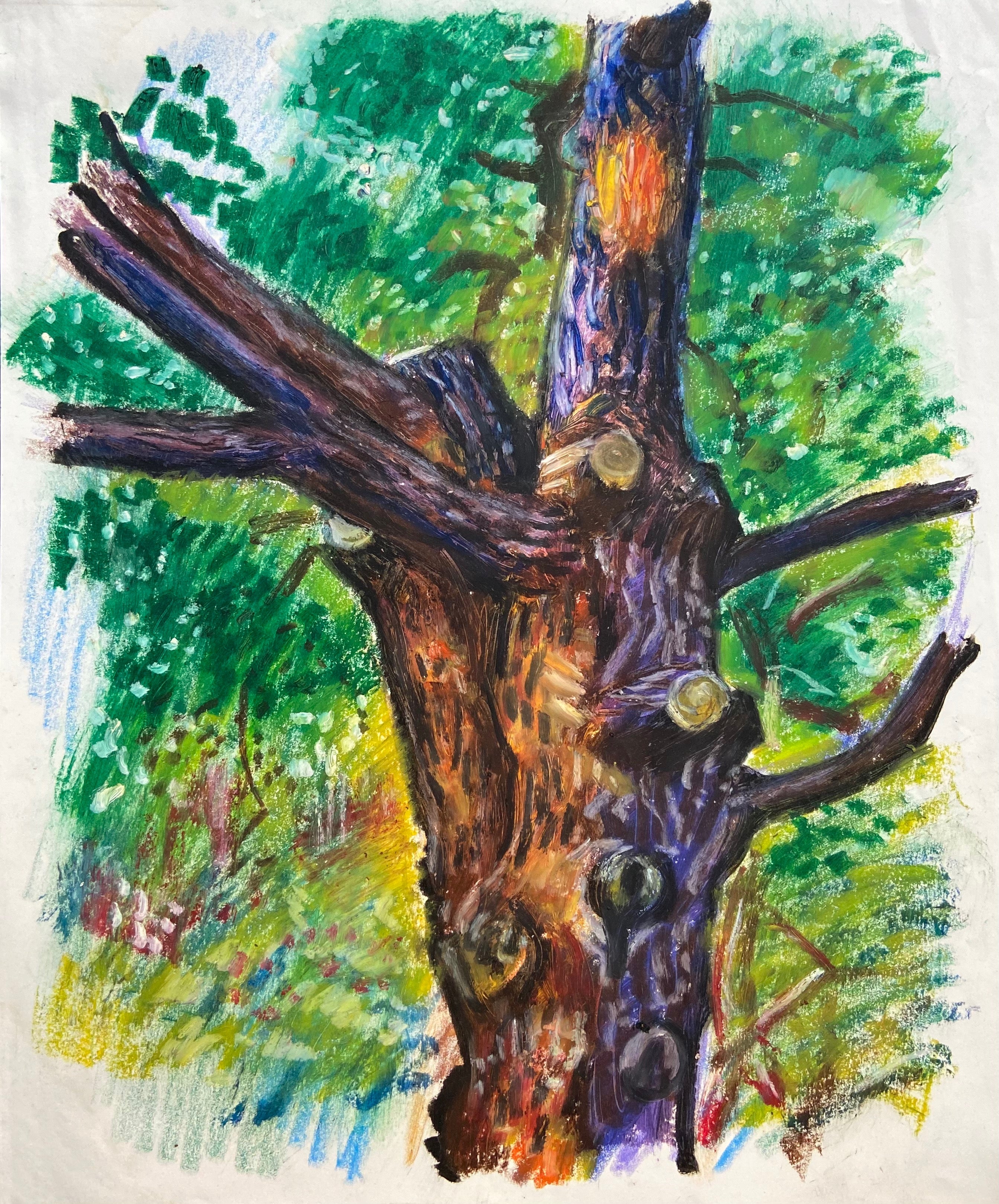 An oil stick drawing of a tree trunk, every gnarl and twist of bark captured on the paper.
