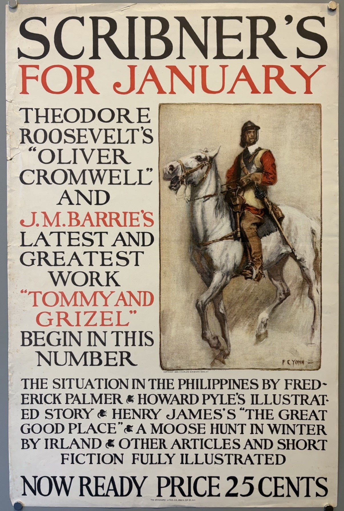 Original advertisement for Scribner's Magazine, an American periodical published by the publishing house of Charles Scribner's Sons from January 1887 to May 1939. It was he first of any magazine to introduce color illustrations and contained many engravings by famous artists of the 19th and early 20th centuries, as well as articles by important authors of the time, including John Thomason, Elisabeth Woodbridge Morris, Clarence Cook, and President Theodore Roosevelt.