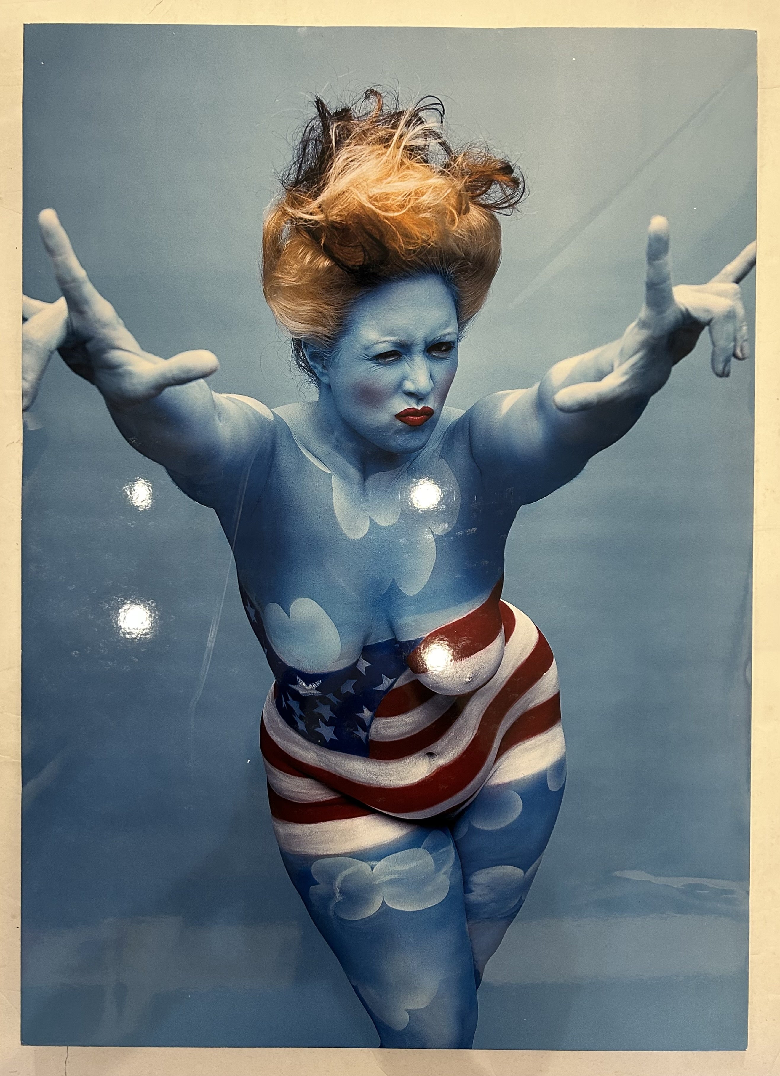 The Six of Hearts features a three-quarters portrait of a person painted sky-blue with stylized clouds all over their body, pink blush, red lipstick, and an American flag adorning most of their torso.