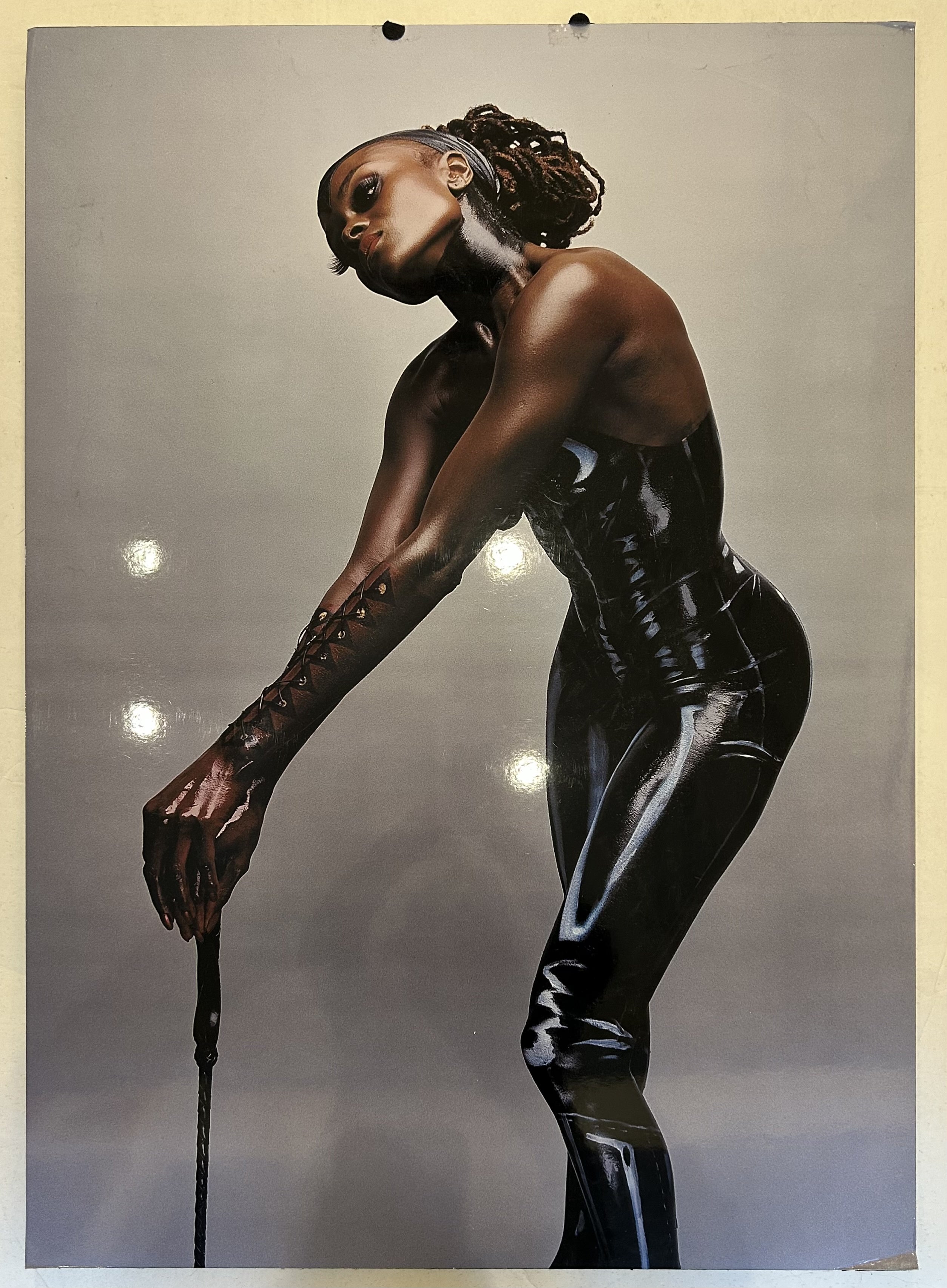 The Six of Spades features a near-full body shot of an individual painted in black with light blue highlights, designed to look like a sleeveless latex bodysuit with forearm sleeves. The person wears dramatic false eyelashes, and holds a whip.