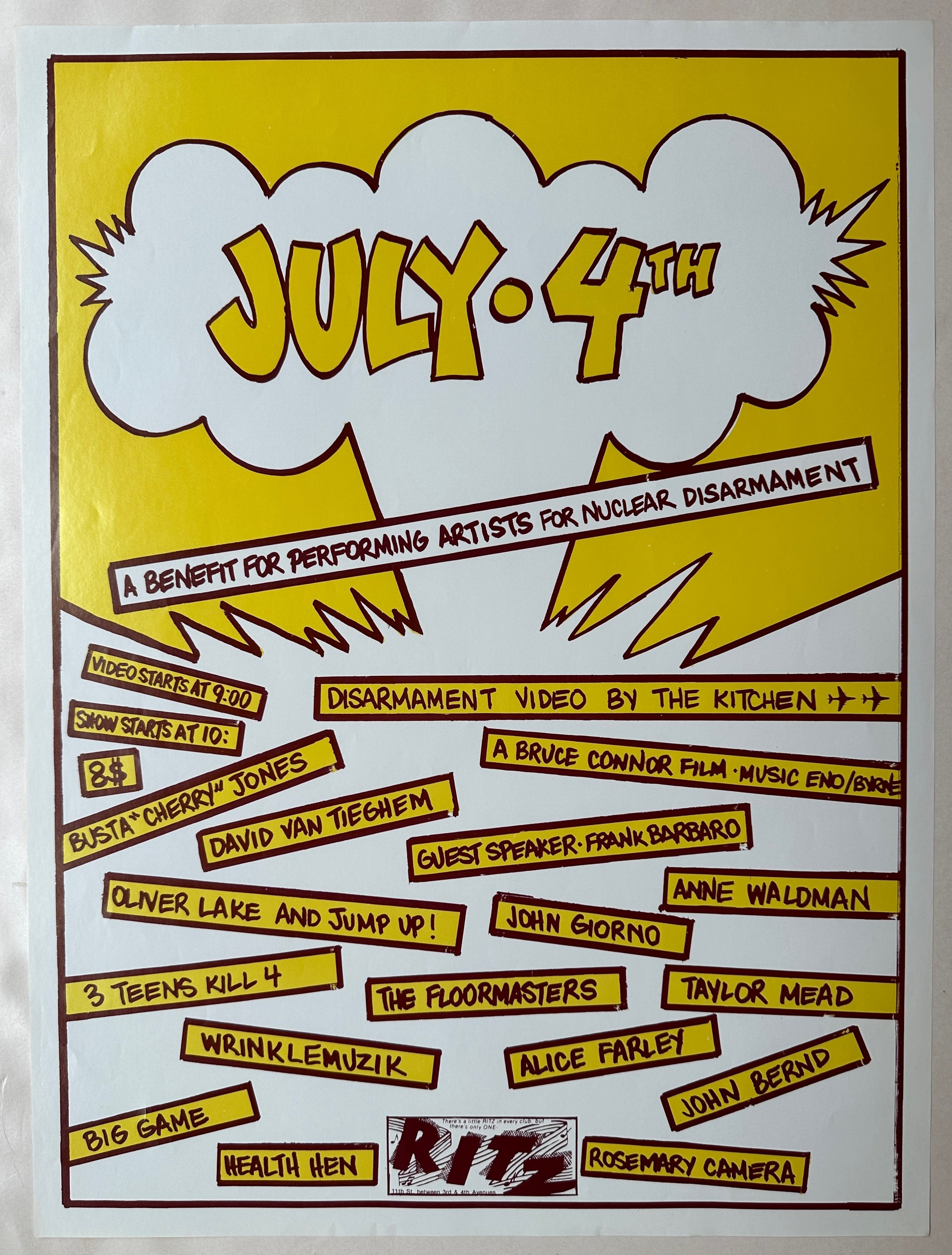 "July 4th / A Benefit for Performing Artists for Nuclear Disarmament / Disarmament Video by the Kitchen / A Bruce Connor Film - Music Eno/Byrne / Guest Speaker - Frank Barbaro / RITZ"