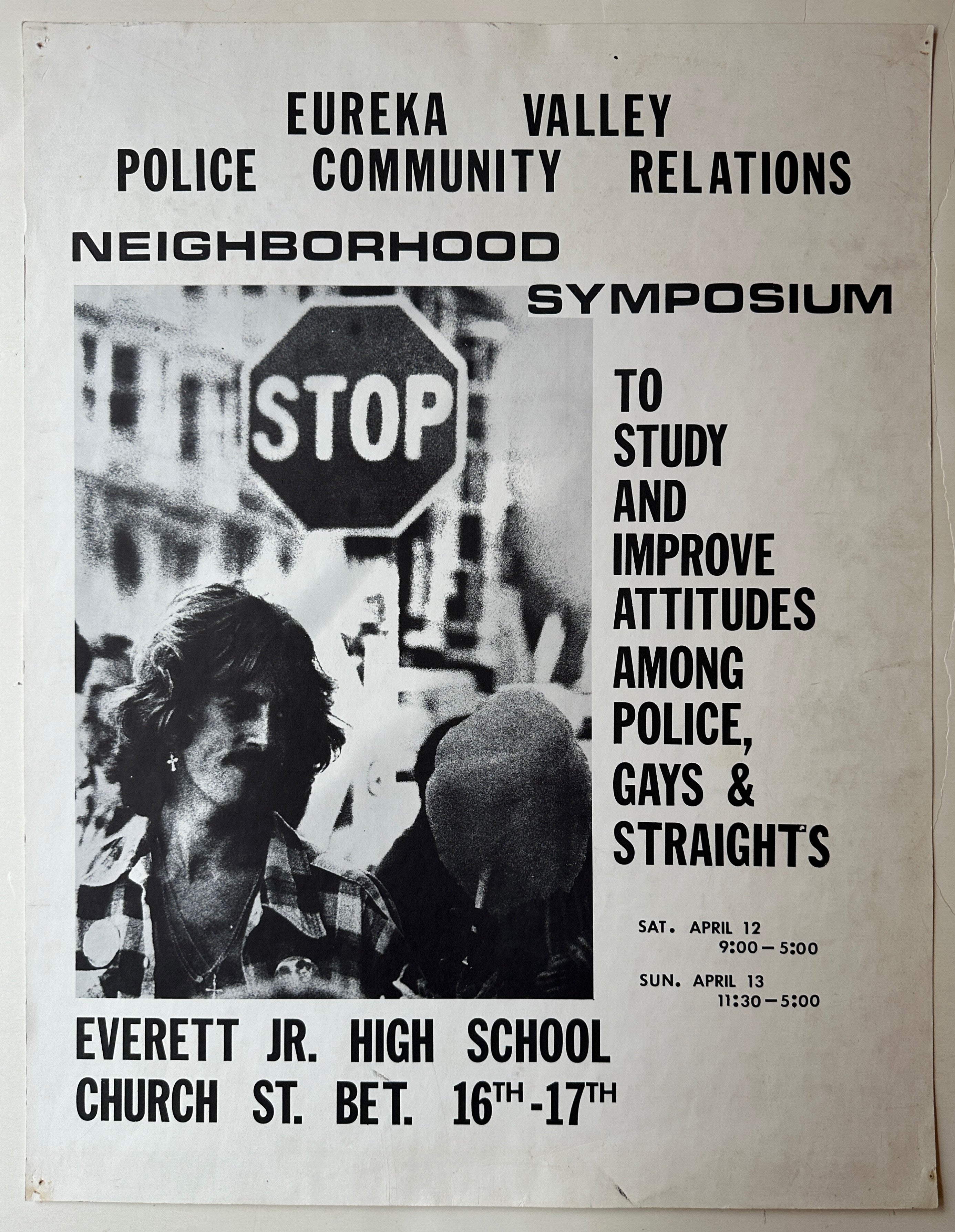 "Eureka Valley Police Community Relations / Neighborhood Symposium / To Study and Improve Attitudes Among Police, Gays & Straights / Everett Jr. High School Church St. Bet. 16th-17th"