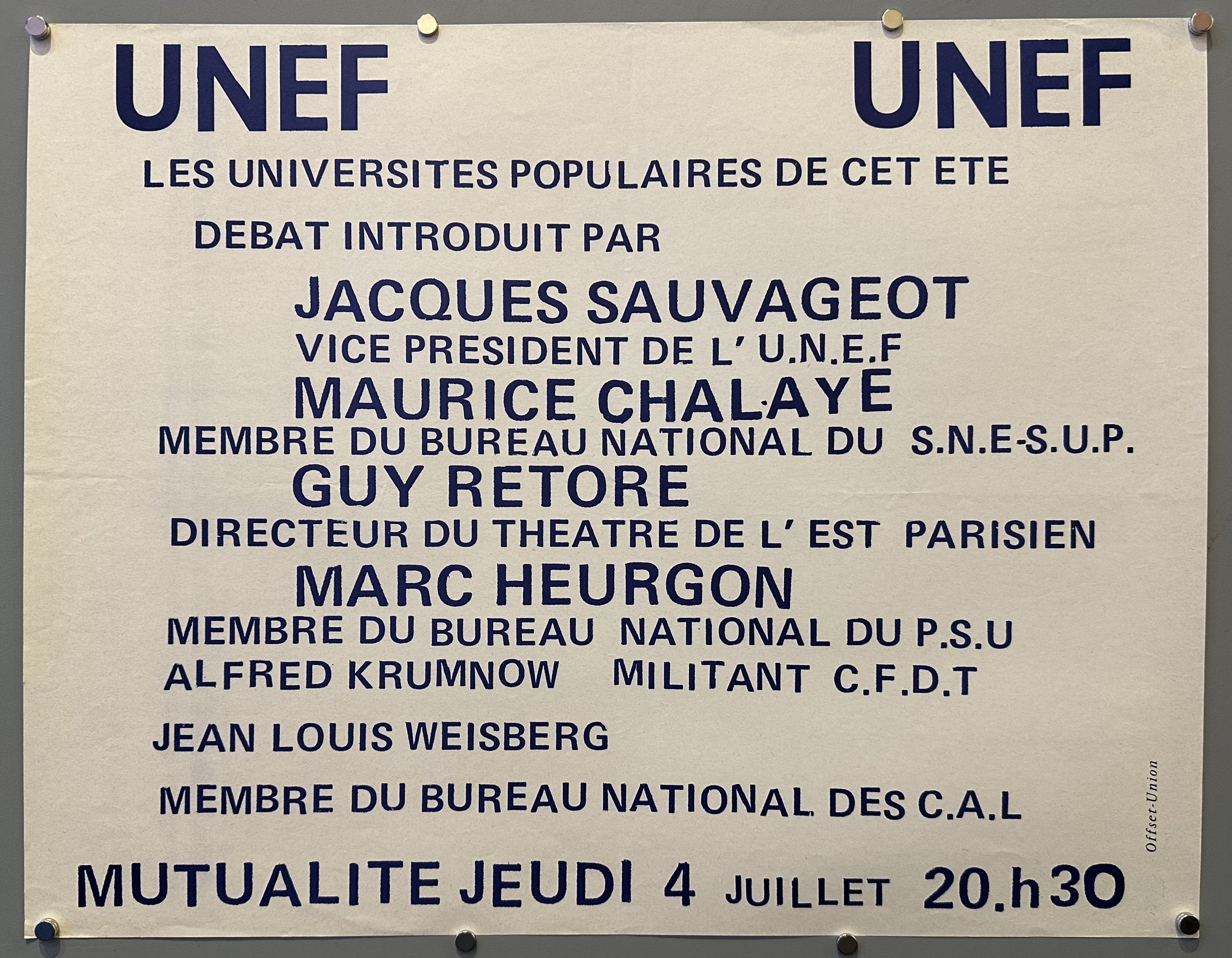 English translation: "UNEF / The Popular Universities of This Summer / Debate Introduced by Jacques Sauvageot Vice President of UNEF / Maurice Chalaye, Guy Retore, Marc Heurgon"