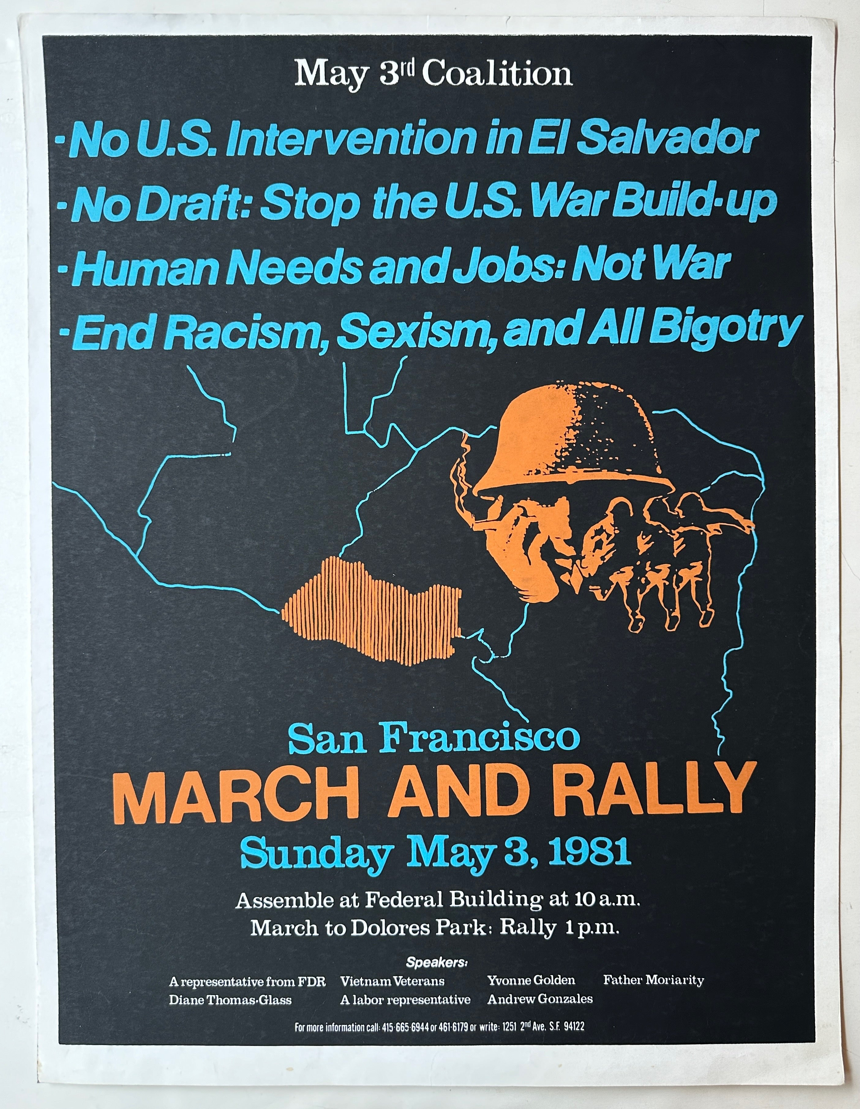 "May 3rd Coalition / No U.S. Intervention in El Salvador, No Draft: Stop the US War Build-up, Human Needs and Jobs: Not War, End Racism, Sexism, and All Bigotry / San Francisco March and Rally Sunday May 3, 1981 / Assemble at Federal Building at 10 a.m. / March to Dolores Park: Rally 1 p.m."