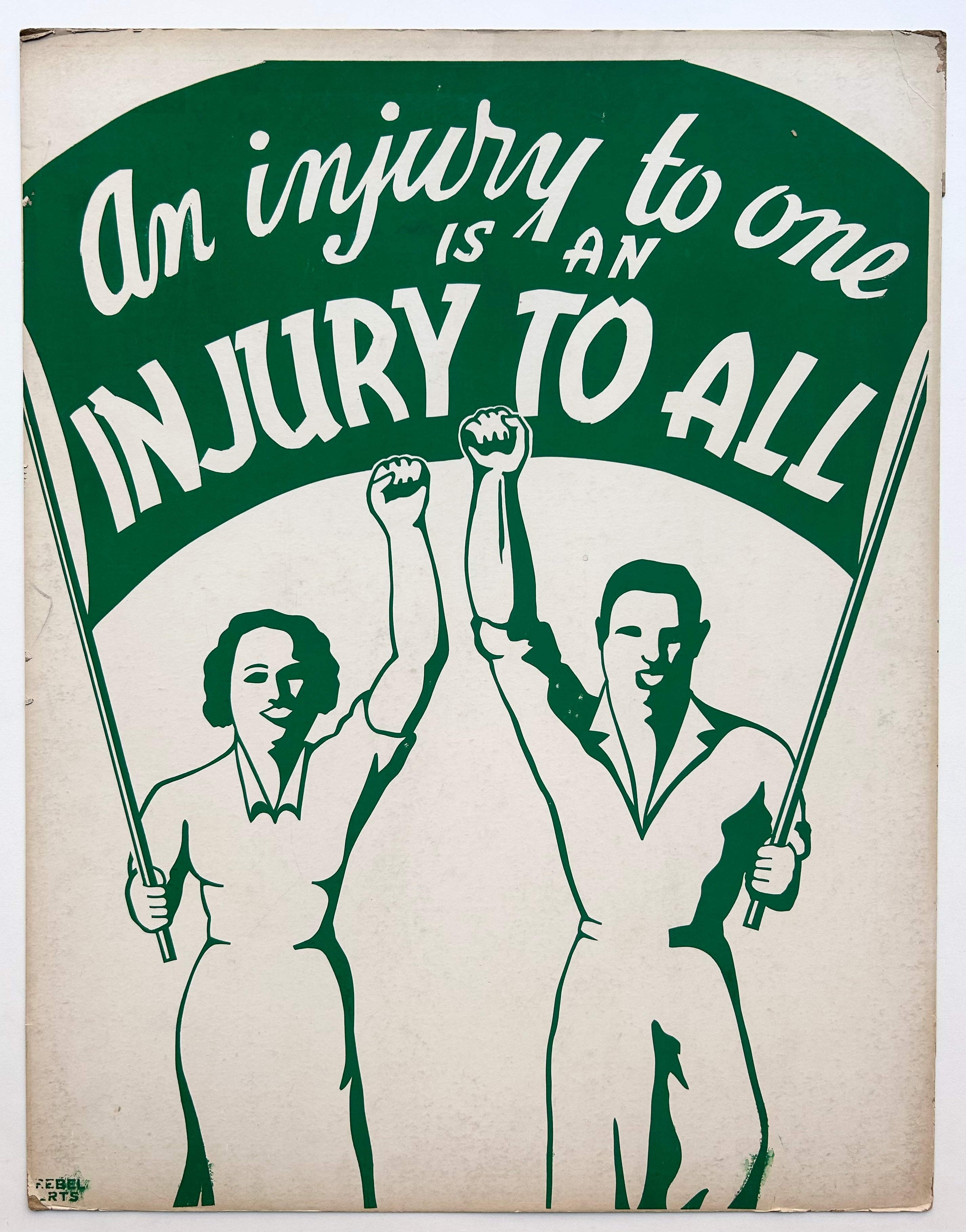 This stunning vintage piece comes from a Depression-era activist organization, Rebel Arts Group, as inscribed on the bottom left corner. According to John Foster of the Design Observer, "Rebel Arts Group was formed in 1934 by a group of students...[and] emerged as the Socialist Party’s answer to the Communist's John Reed Club of New York. Led by writer and Socialist Party officer Samuel H. Friedman (1897–1990), Rebel Arts produced plays, music, and murals exploring the intersection of art and revolutionary ideology." Posters like these were used in protests and parades during the Great Depression advocating for worker rights. This is part of a rare series printed during the years 1936–39.
