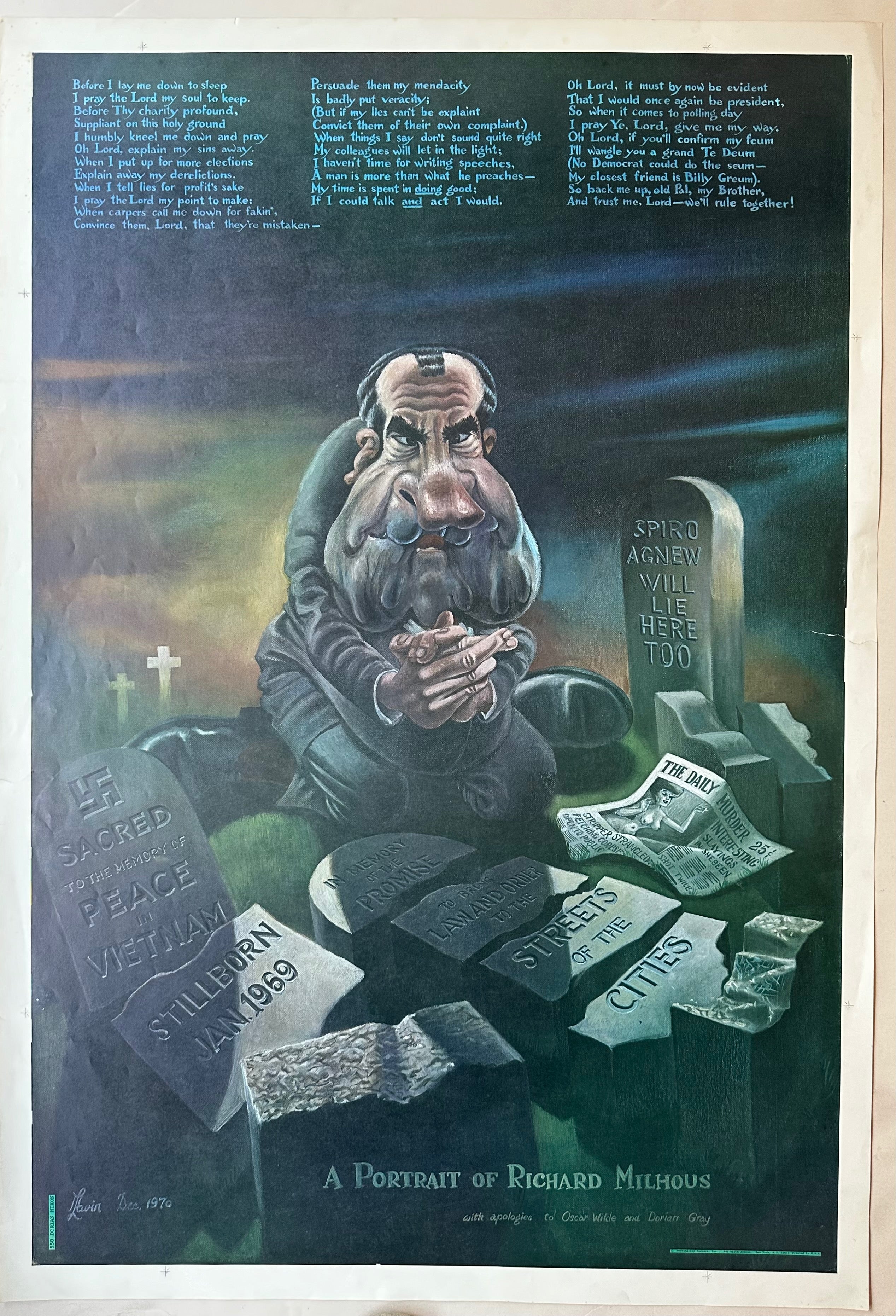Anti-Nixon, anti-war poster featuring a grotesque caricature of Richard Nixon below a modified version of the prayer "Now I lay me down to sleep", portraying Nixon as praying in regards to his corruption. He kneels surrounded by primarily broken gravestones referencing current politics; for example, one is engraved with a swastika with the text "SACRED TO THE MEMORY OF PEACE IN VIETNAM / STILLBORN JAN. 1969".