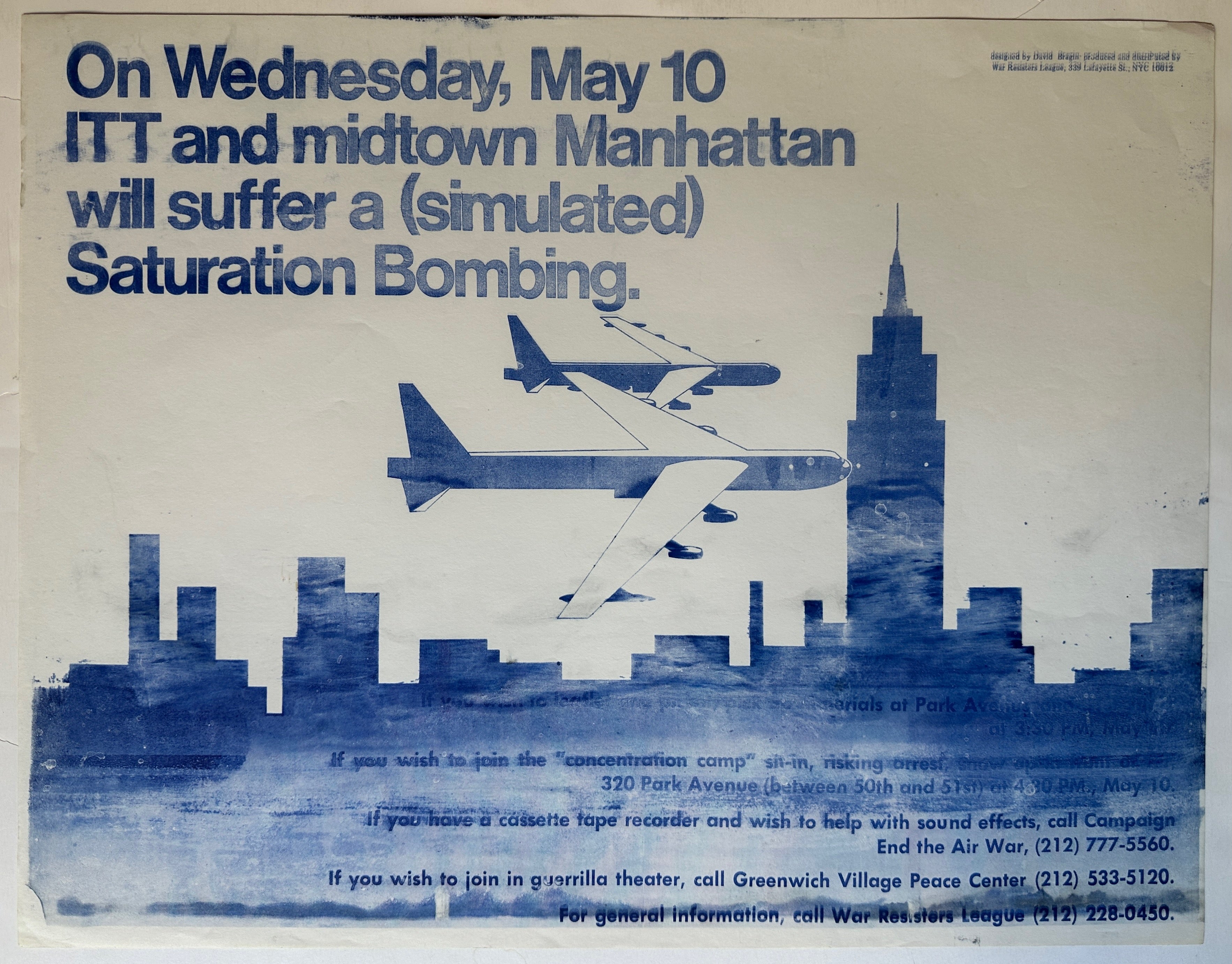 Features stylized block-color NYC skyline and two large aircrafts in blue. Information at the bottom reads "If you wish to leaflet and picket, pick up materials at Park Avenue and 51st Street / at 3:30 PM, May 10. / If you wish to join the 'concentration camp' sit-in, risking arrest, show up in front of ITT, / 320 Park Avenue (between 50th and 51 st) at 4:30 PM., May 10. / If you have a cassette tape recorder and wish to help with sound effects, call Campaign / End the Air War, (212) 777-5560. / If you wish to join in guerrilla theater, call Greenwich Village Peace Center (212) 533-5120. / For general information, call War Resisters League (212) 228-0450."