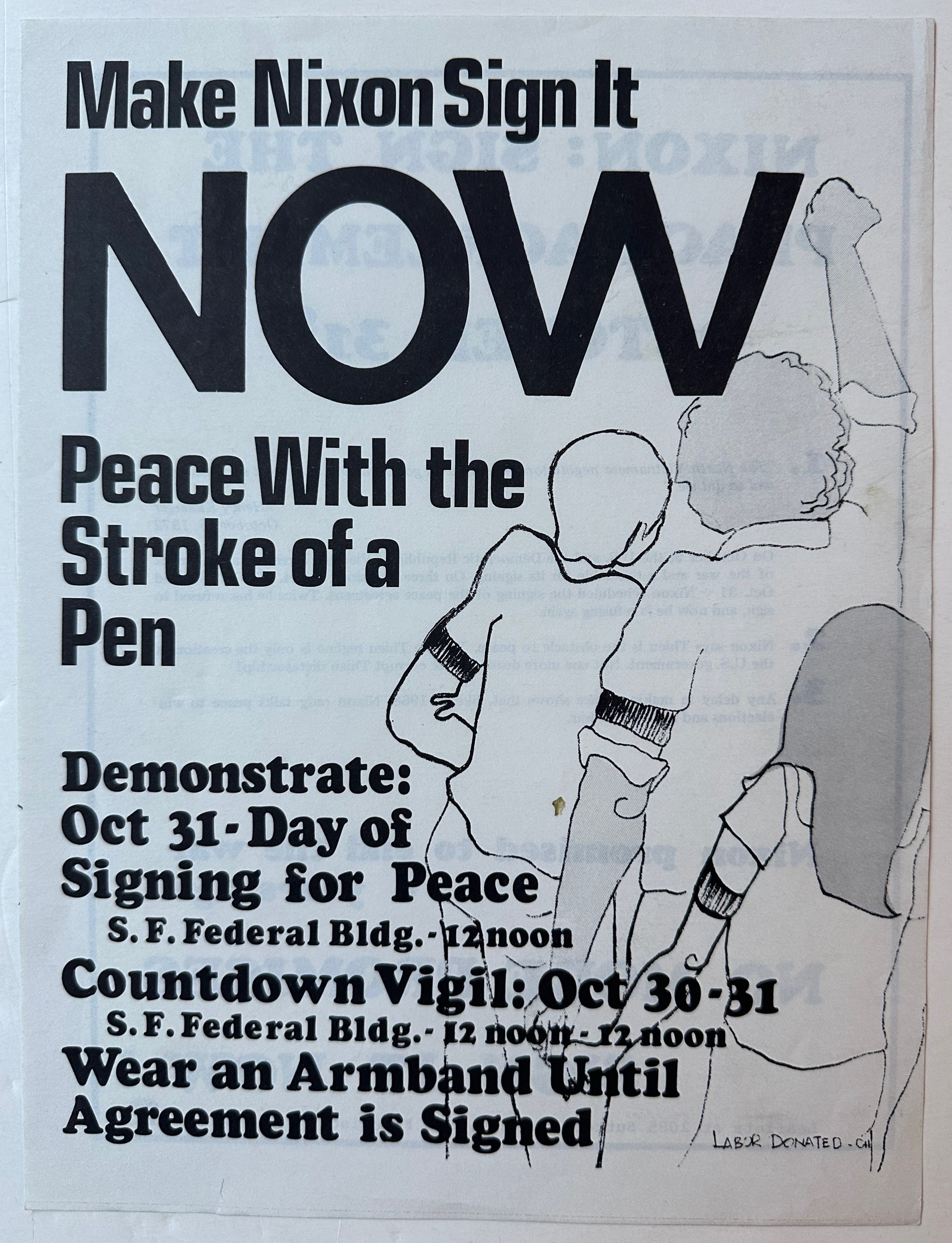 SIDE A: "MAKE NIXON SIGN IT NOW / Peace With the / Stroke of a / Pen / Demonstrate: / Oct 31 - Day of / Signing for Peace / S.F. Federal Bldg. - 12noon / Countdown Vigil: Oct 30-31 / S.F. Federal Bldg. - 12 noon - 12 noon / Wear an Armband Until / Agreement is Signed"
