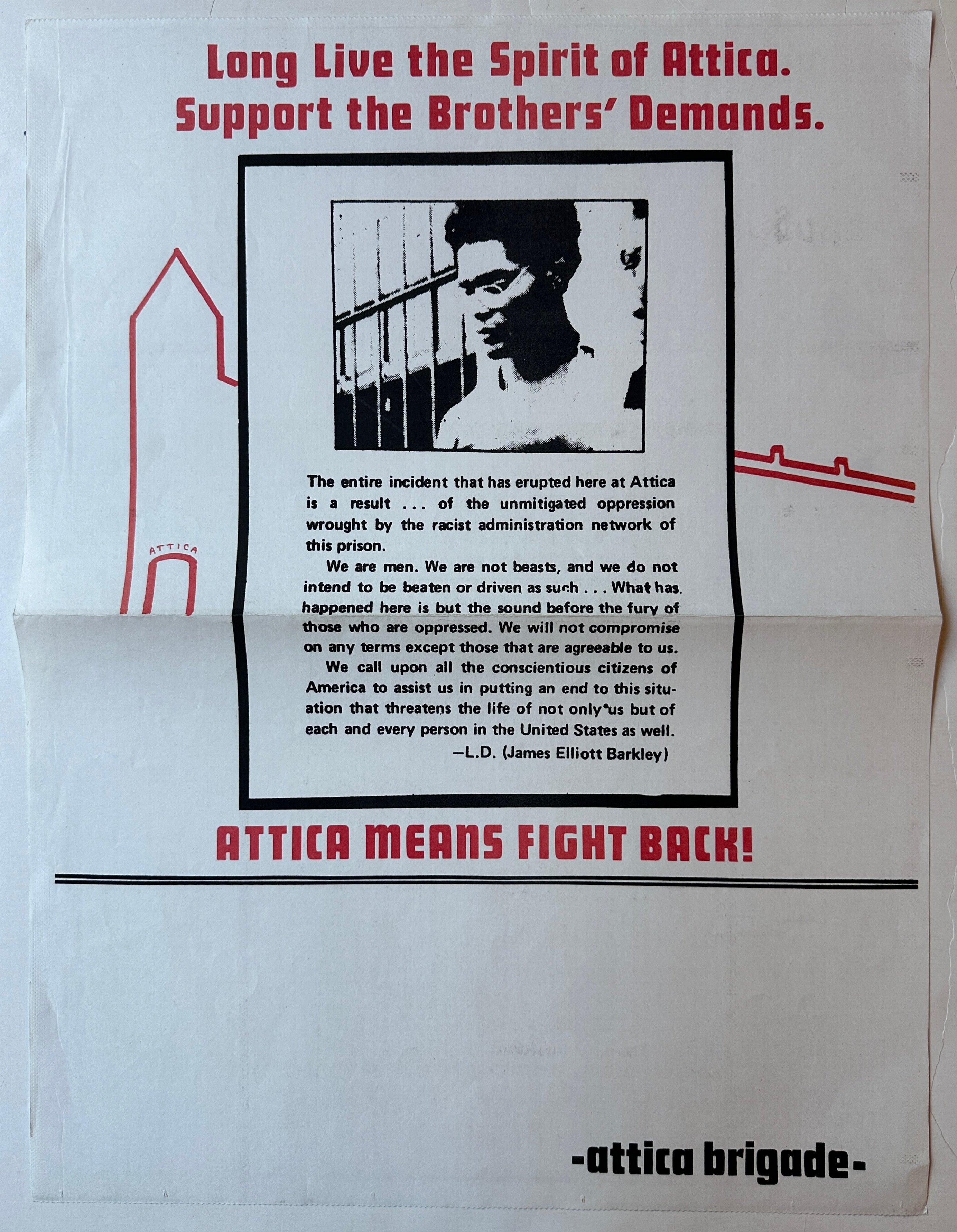 This political protest poster features a quote from James Elliott Barkley--an African-American inmate and the leader of the 1971 Attica Prison riot.