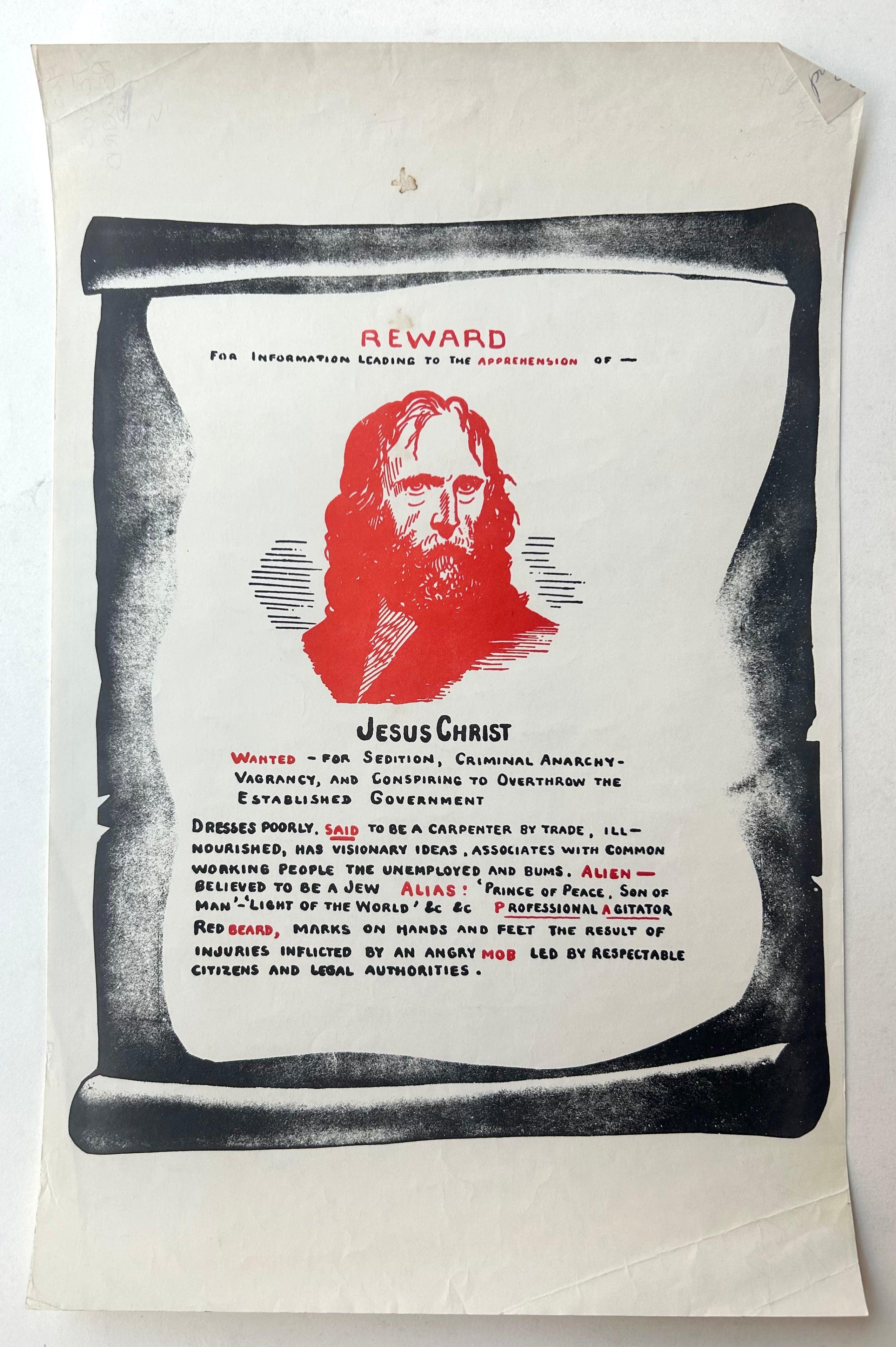 "Reward, for information leading to the apprehension of -- Jesus Christ. Wanted for sedition, criminal anarchy - vagrancy, and conspiring to overthrow the established government. Dresses poorly. Said to be a carpenter by trade, ill-nourished, has visionary ideas, associates with common working people, etc."