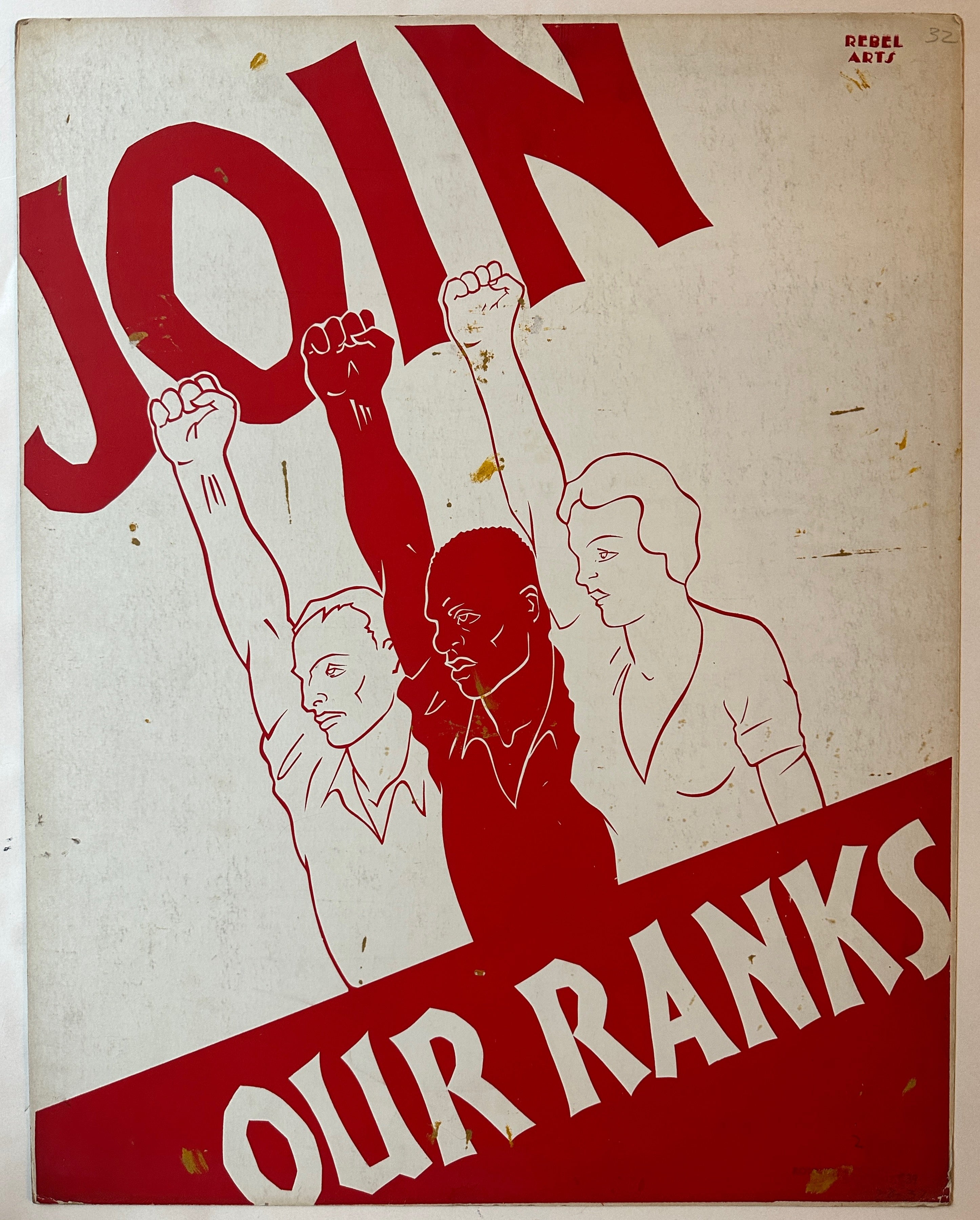 1930s Rebel Arts poster advocating for worker's unions featuring two men and one woman side by side with fists raised, red and white. Union bug in bottom right.
