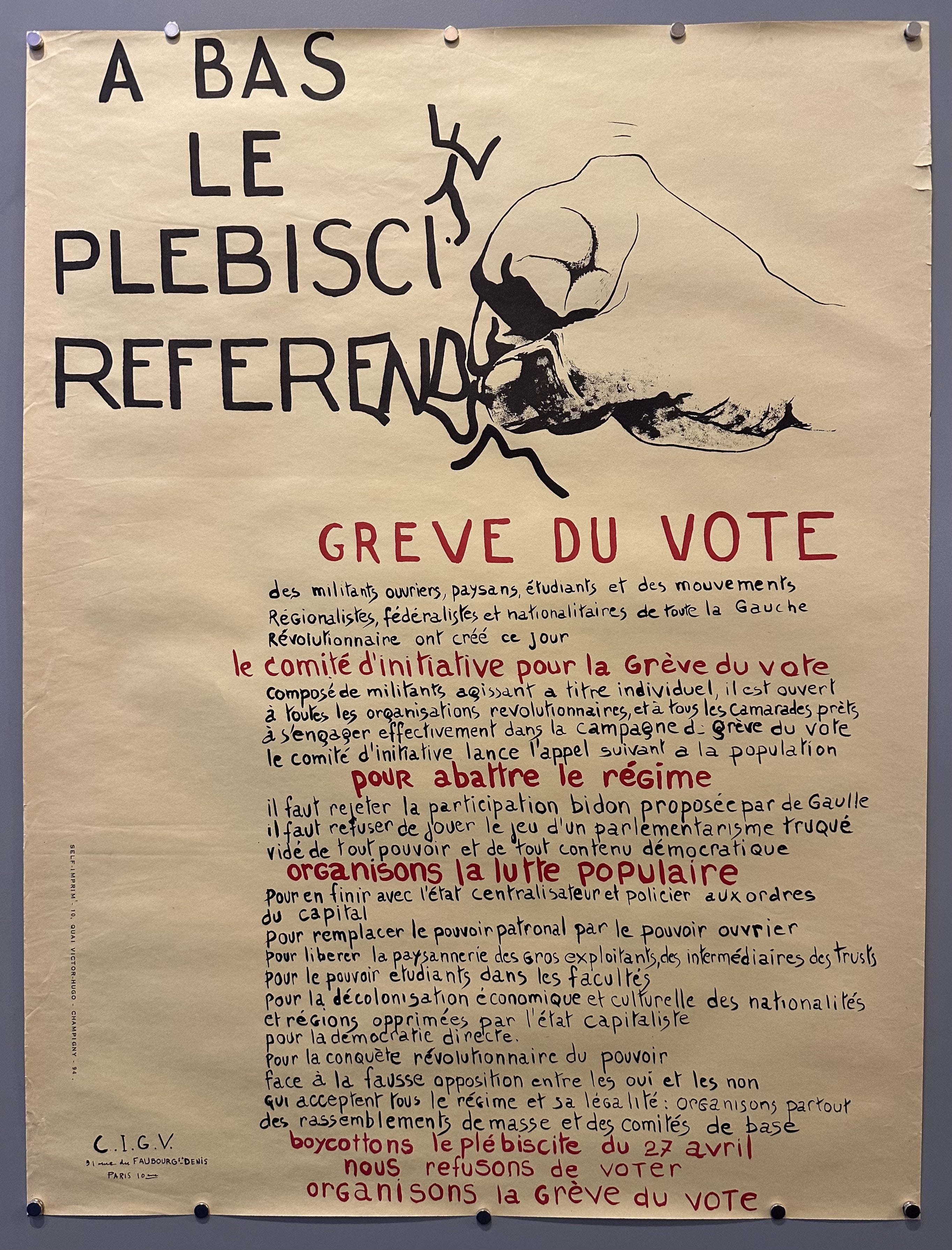 Anti-voting protest poster produced during May 1968 (Mai 68) in France. Mai 68 was a significant period of social unrest for students and the working class under Charles de Gaulle's administration. These protestors designed and utilized bold and simple posters to galvanize support.