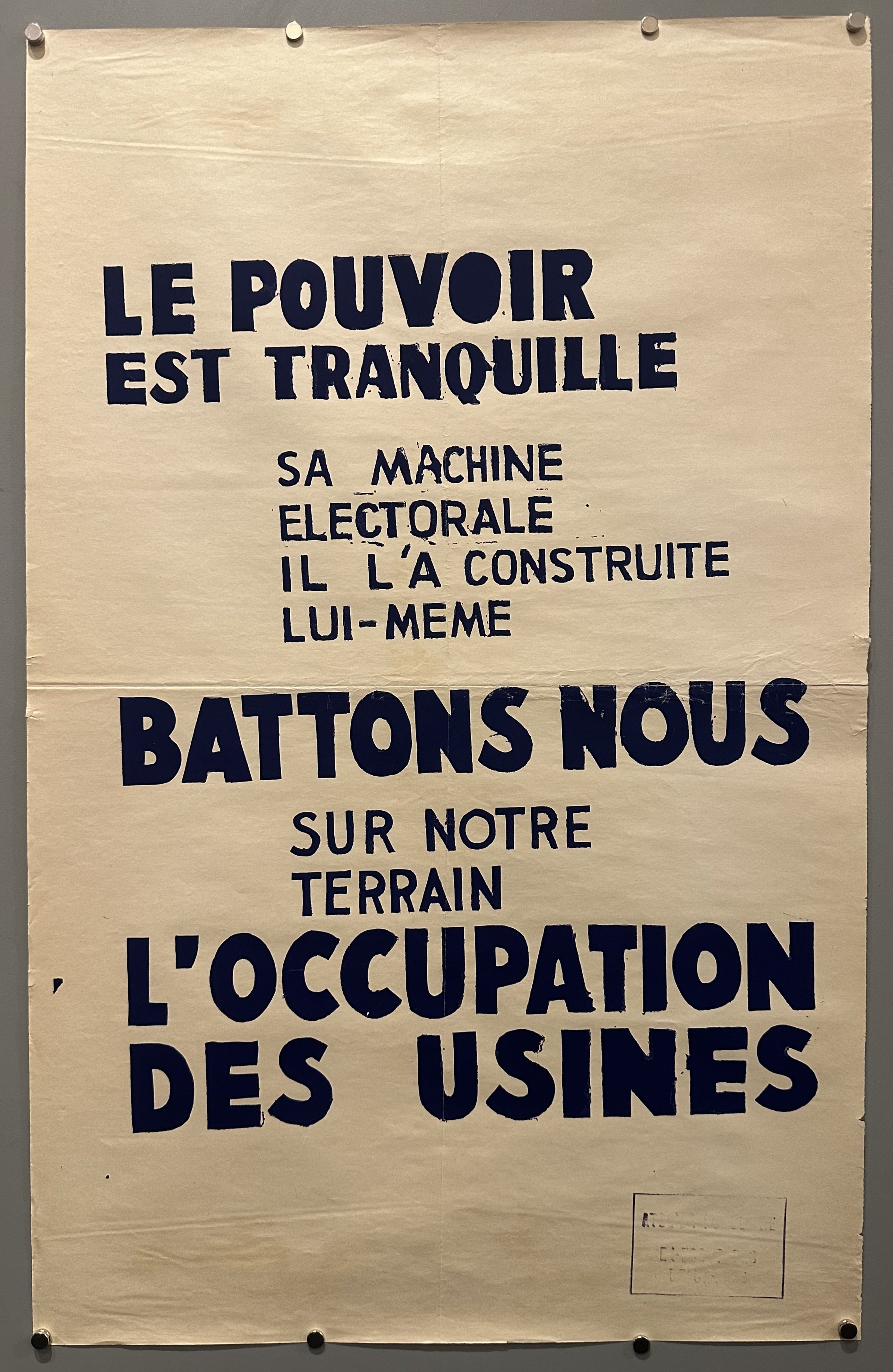 English translation: "The Power Is Quiet / He Built His Electoral Machine Himself / Let's Fight On Our Ground The Occupation Of The Factories"
