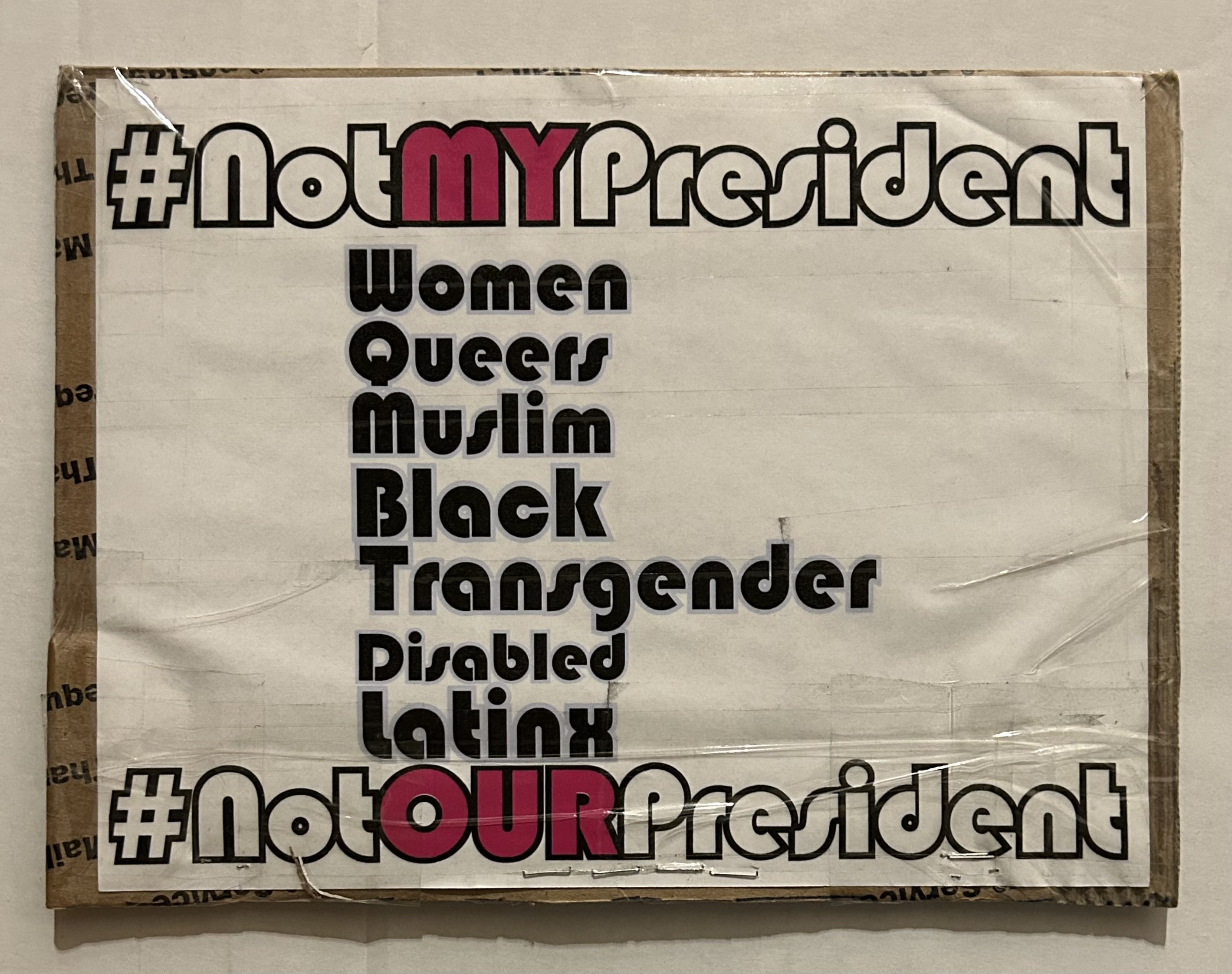 Millions of people in cities all over the world demonstrated against Donald Trump's presidential election on January 21, 2017 as part of The Women's March. This sign is just another preserved piece of historic protest that showcases the ability of collective action to amplify dissatisfaction towards the status quo.
