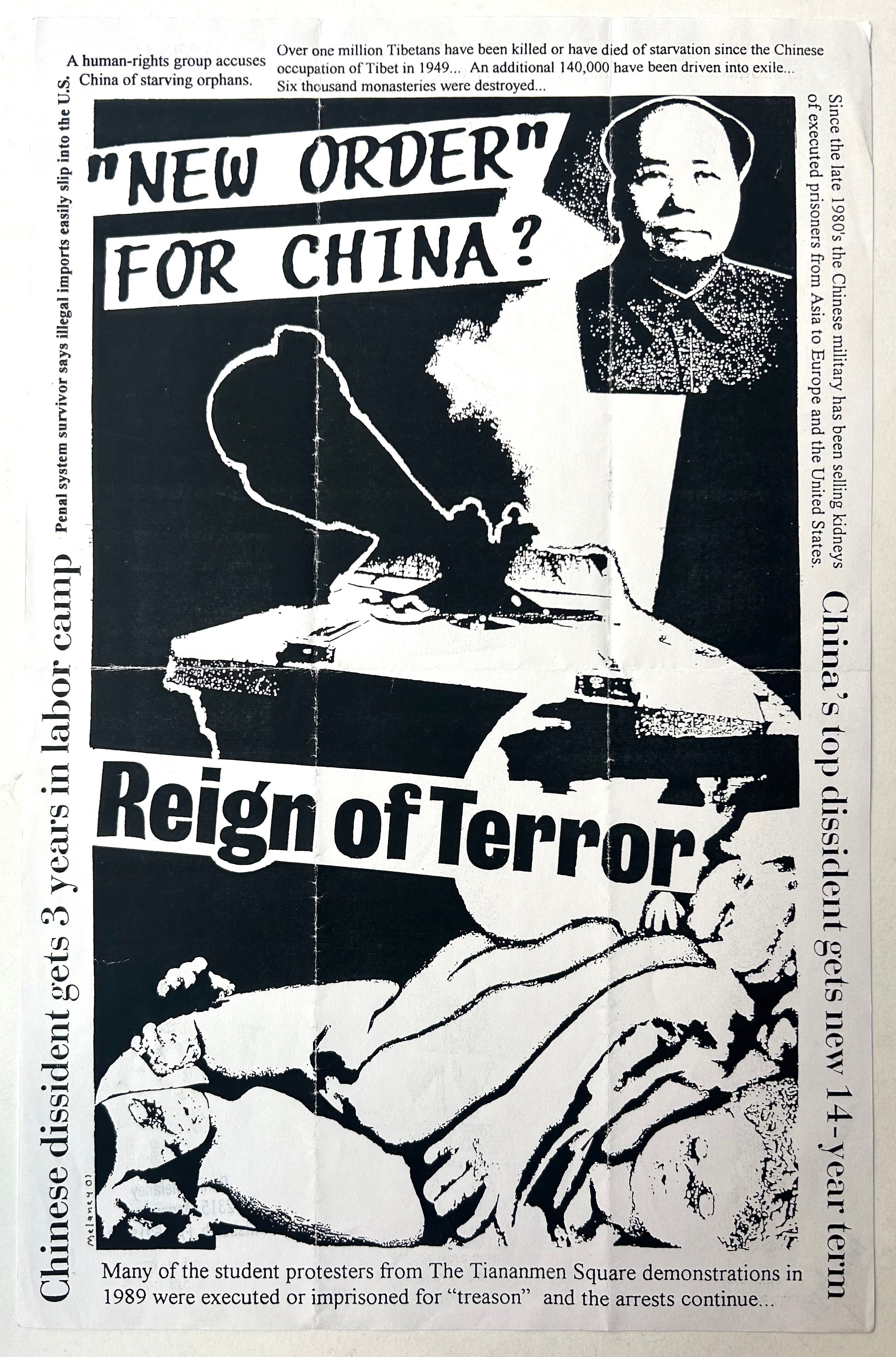 Image: A black and white collage is in the center, including Chairman Mao, a tank, and corpses. Along the sides are various newspaper headlines about the Chinese Communist Party.