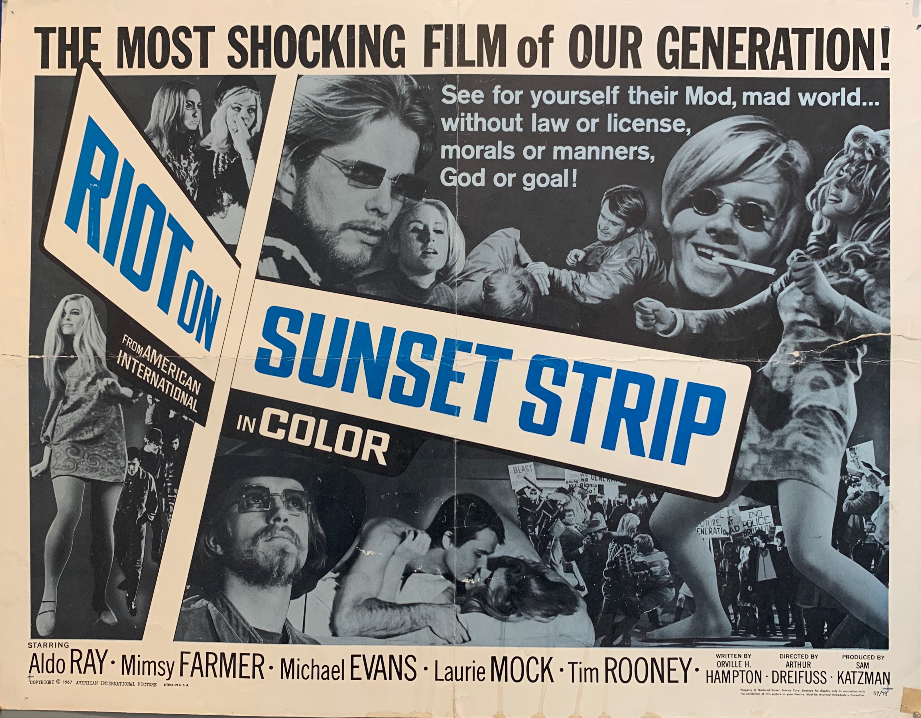 Riot On Sunset Strip Movie Poster, The Most Shocking Film Of Our Generation. See For Yourself Their Mod, Mad World, Without Law Or License, Morals Or Manners, God or Goals. Film Presented By American International.