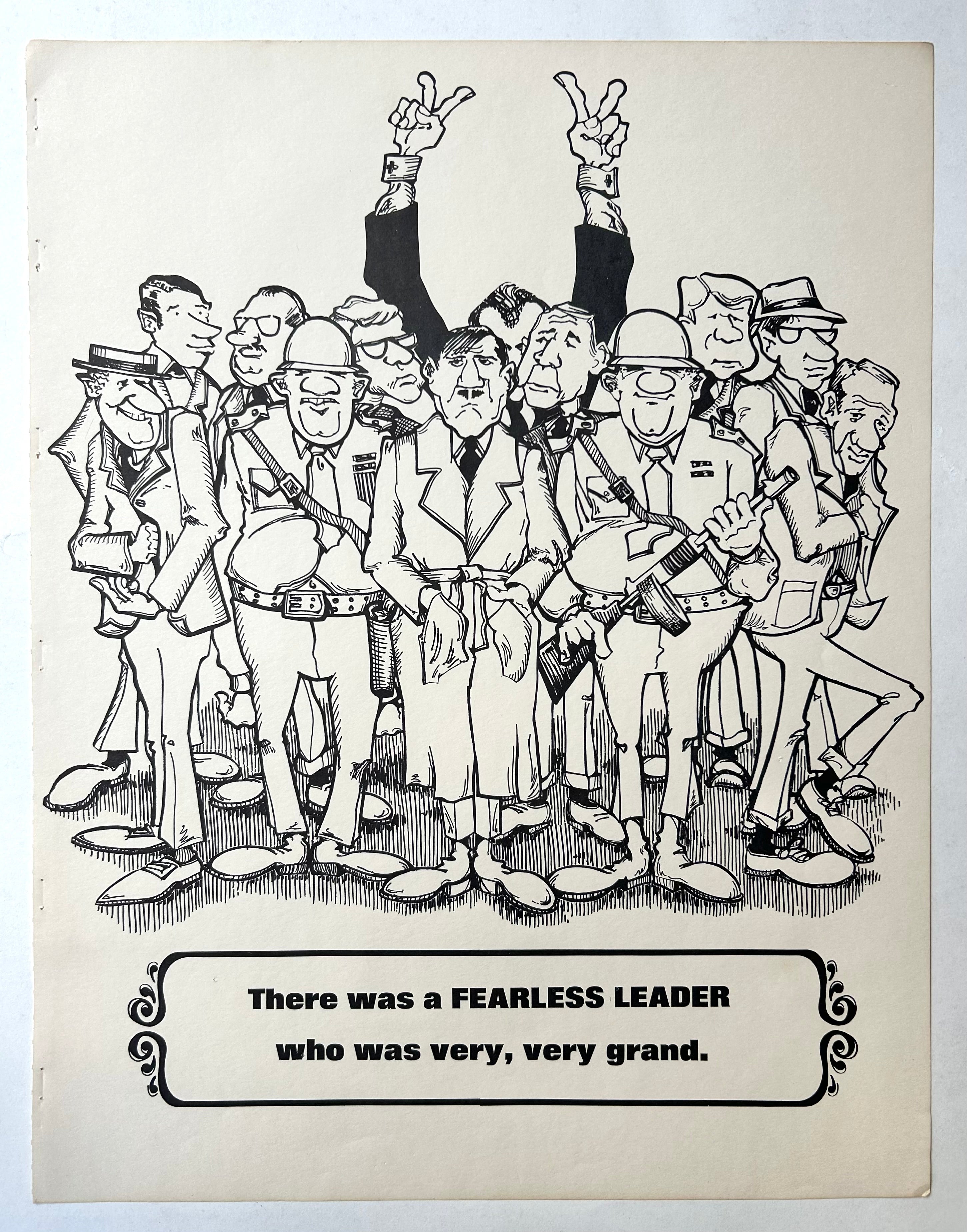 This print comes from a large-scale booklet of satire political cartoons written in 1972 depicting former President Richard Nixon. The cover of the book reads, "you may use the materials in this book for: coloring, dart board covers, place mats, conversation provoking, high-power rifle targets, fund raising, guerilla force indoctrination, pin ups, floor protection, archery targets, training aids, inspiration, party pooping, scratch pad, and countless other things."