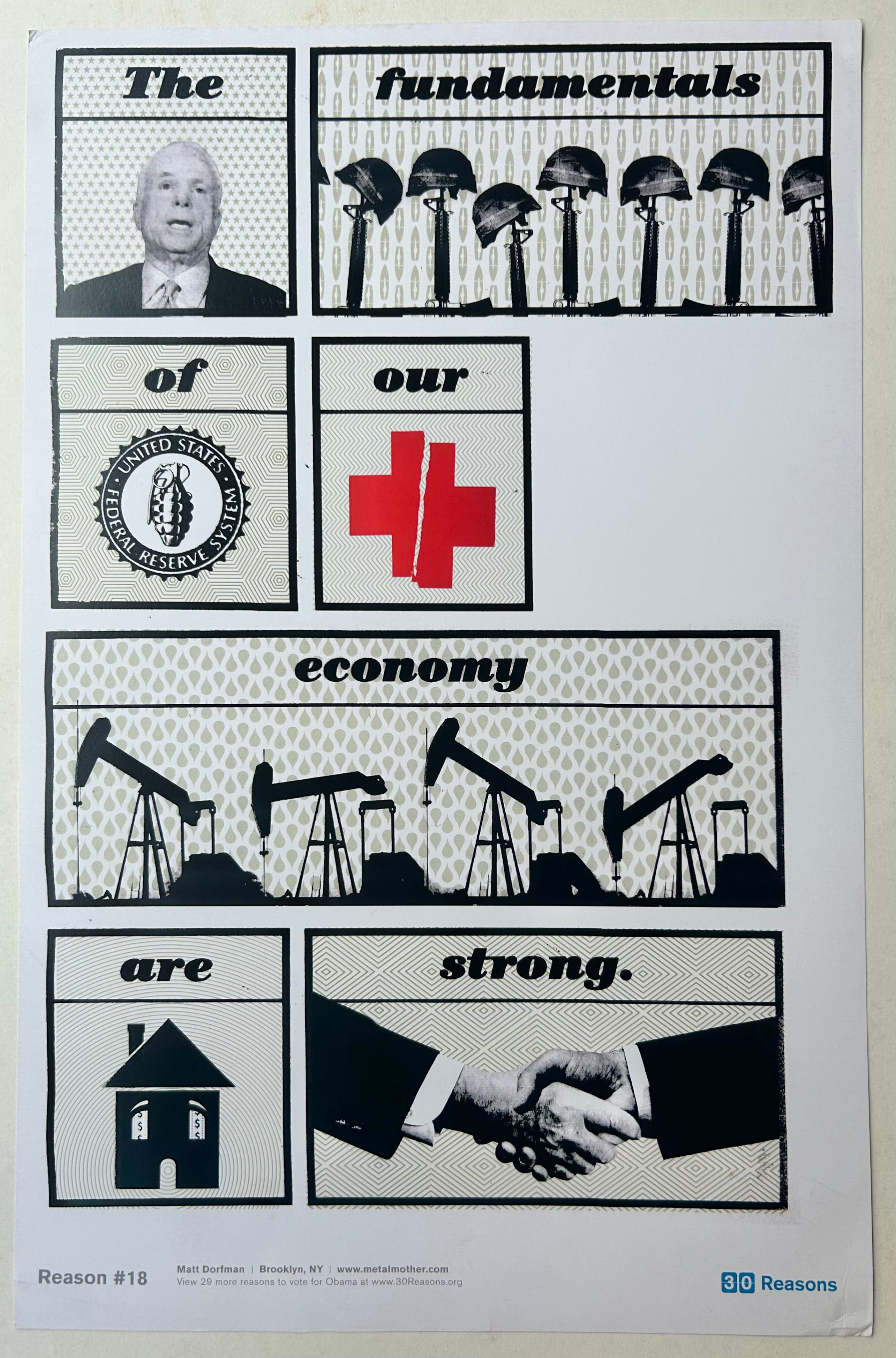 Image: Under each word is a photo alluding to the real meaning of this message, including oil rigs under "economy," and military uniforms under "fundamentals."