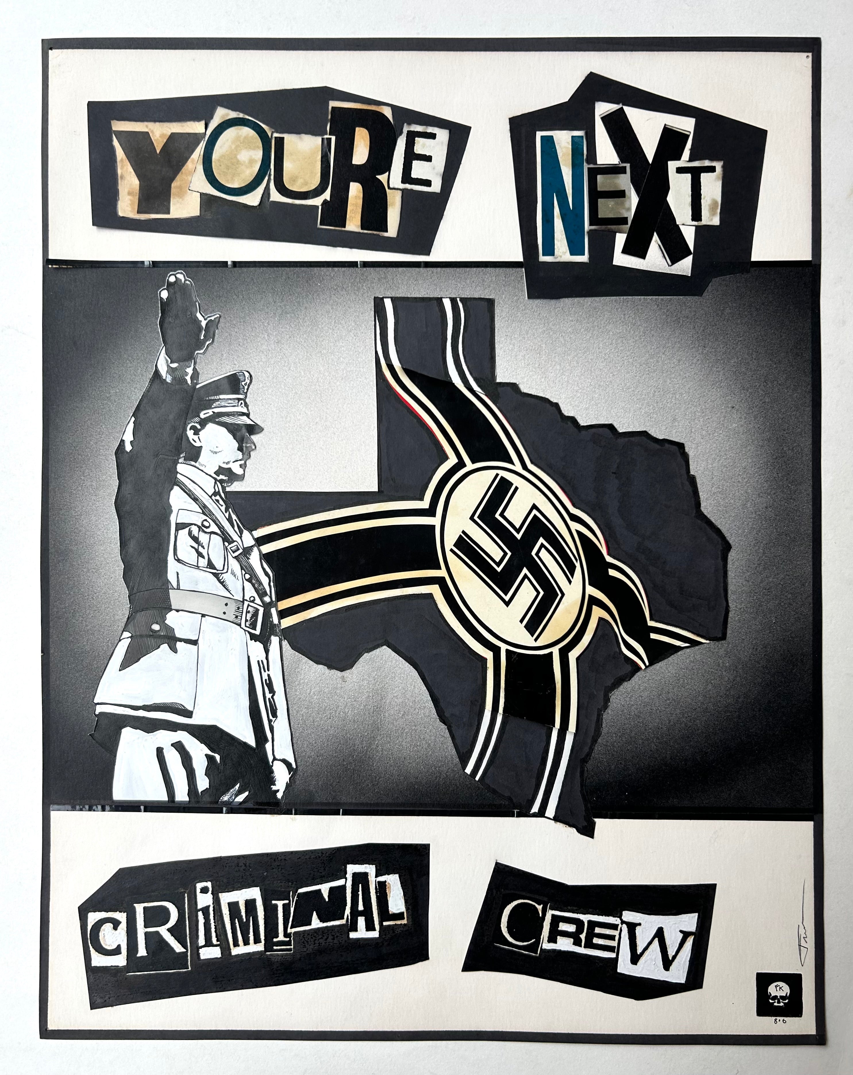 Image: Outline of Texas with a swastika over it and Adolf Hitler next to this image. Text is cut-out in a style reminiscent of ransom notes.