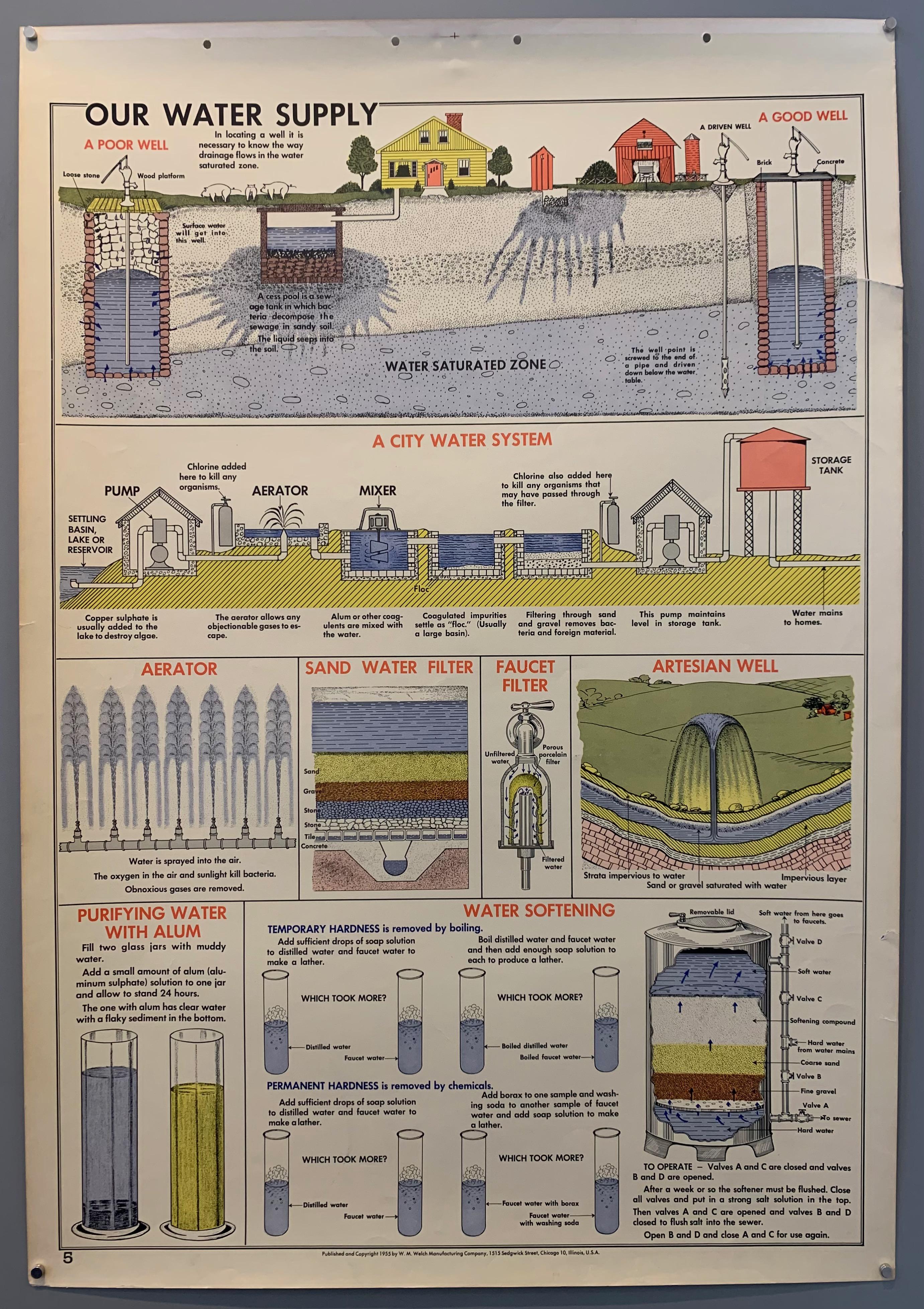 Description: Informational wall chart from the 1950s detailing how a city purifies and distributes water to residents. With colorful illustrations to accompany detailed descriptions of the various processes, this poster is great for any and all decor purposes.