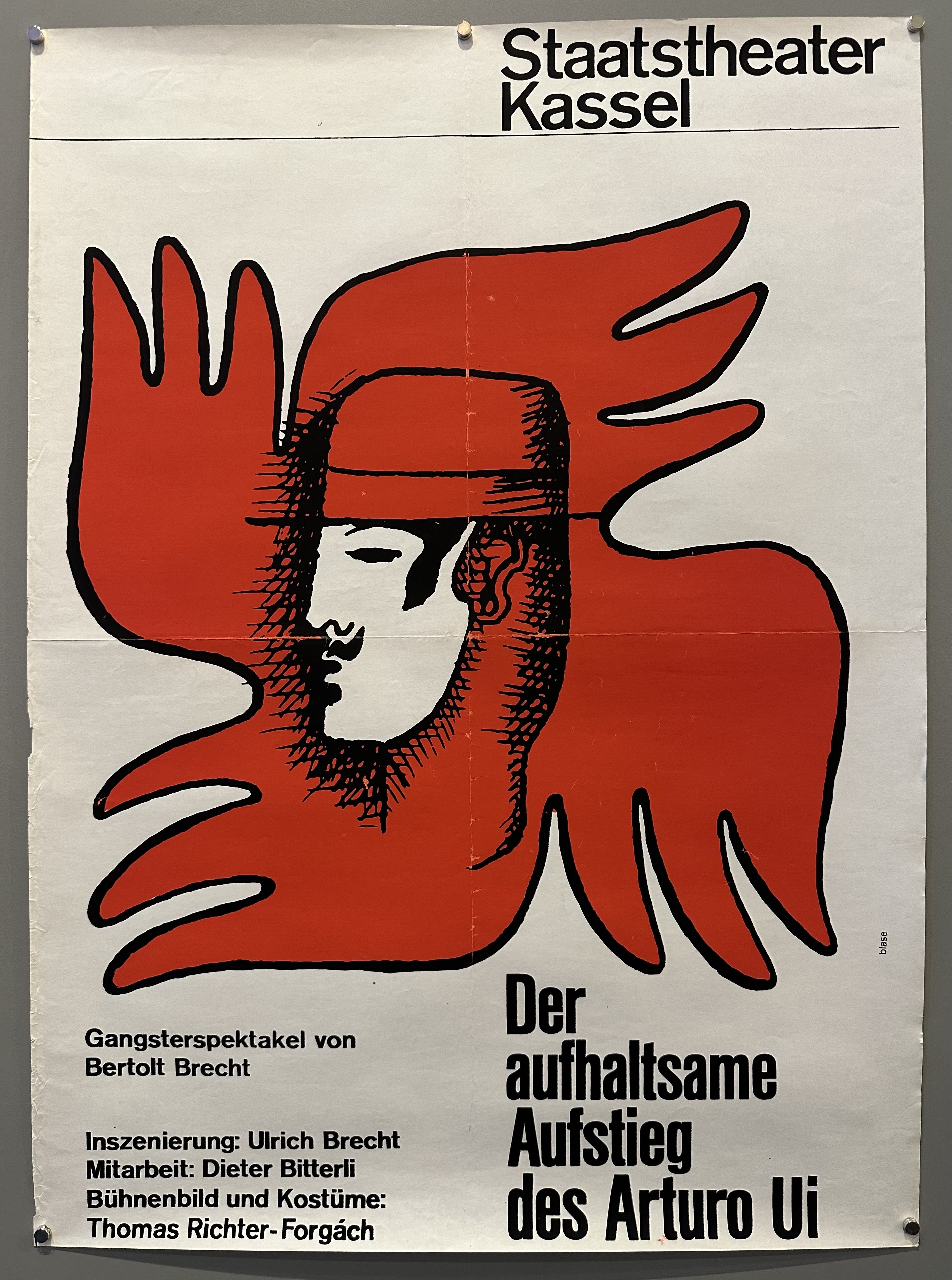 English translation: "Gangster spectacle by Bertolt Brecht / Direction: Ulrich Brecht / Collaboration: Dieter Bitterli / Set design and costumes: Thomas Richter-Forgách / The Resistible Rise of Arturo Ui"