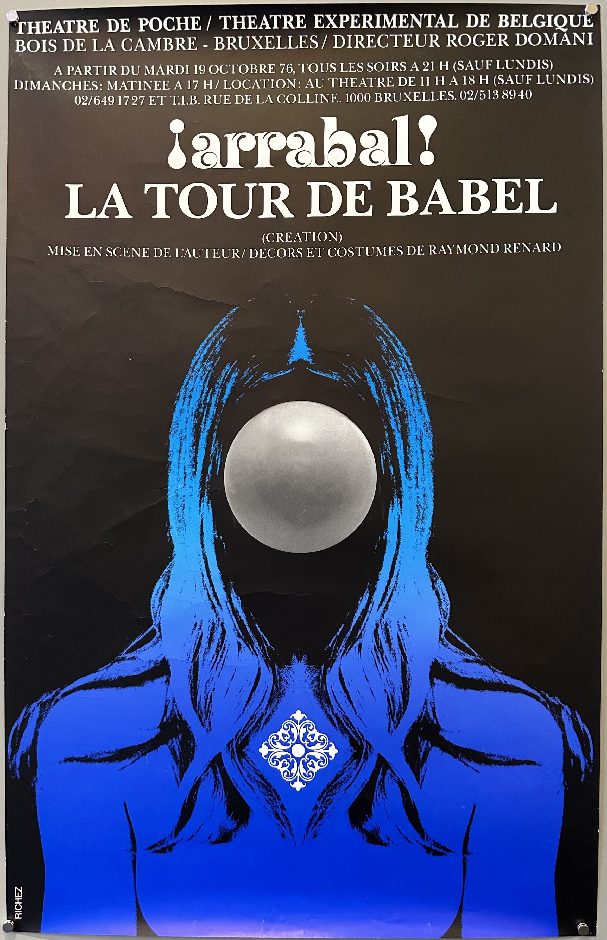 English translation: "Theatre de Poche / Experimental Theatre of Belgium / Bois de la Cambre - Brussels / Director Roger Domani / From Tuesday October 19, 76, Every Evening at 9 p.m. (Except Mondays) / arrabal! / The Tower of Babel / (Creation) Directed by the Author / Sets and Costumes by Raymond Renard"