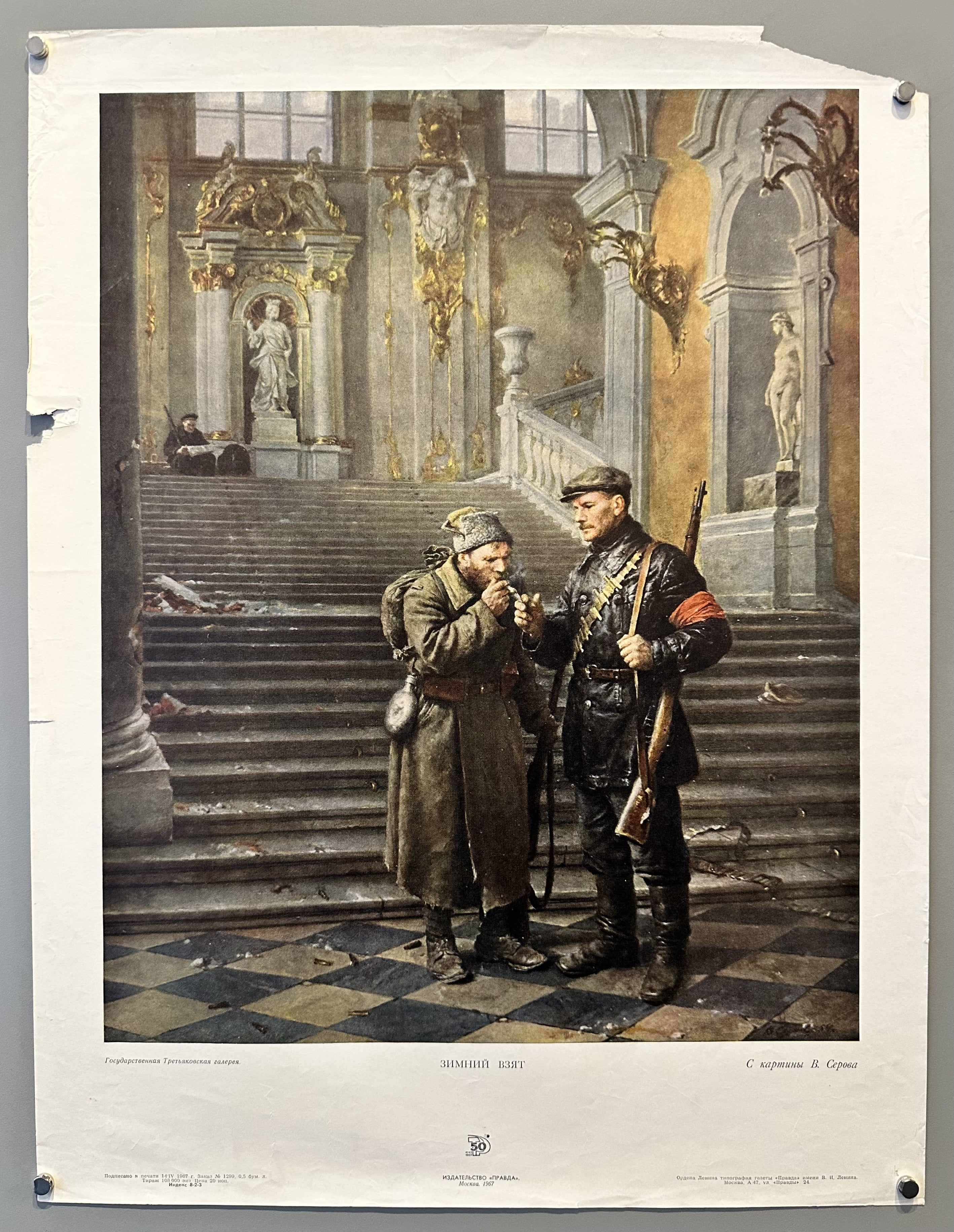 It was issued to celebrate the 50th anniversary of the October Revolution. The painting depicts a quiet moment following the storming of the Winter Palace on October 26, 1917, a pivotal event in the Russian Revolution.