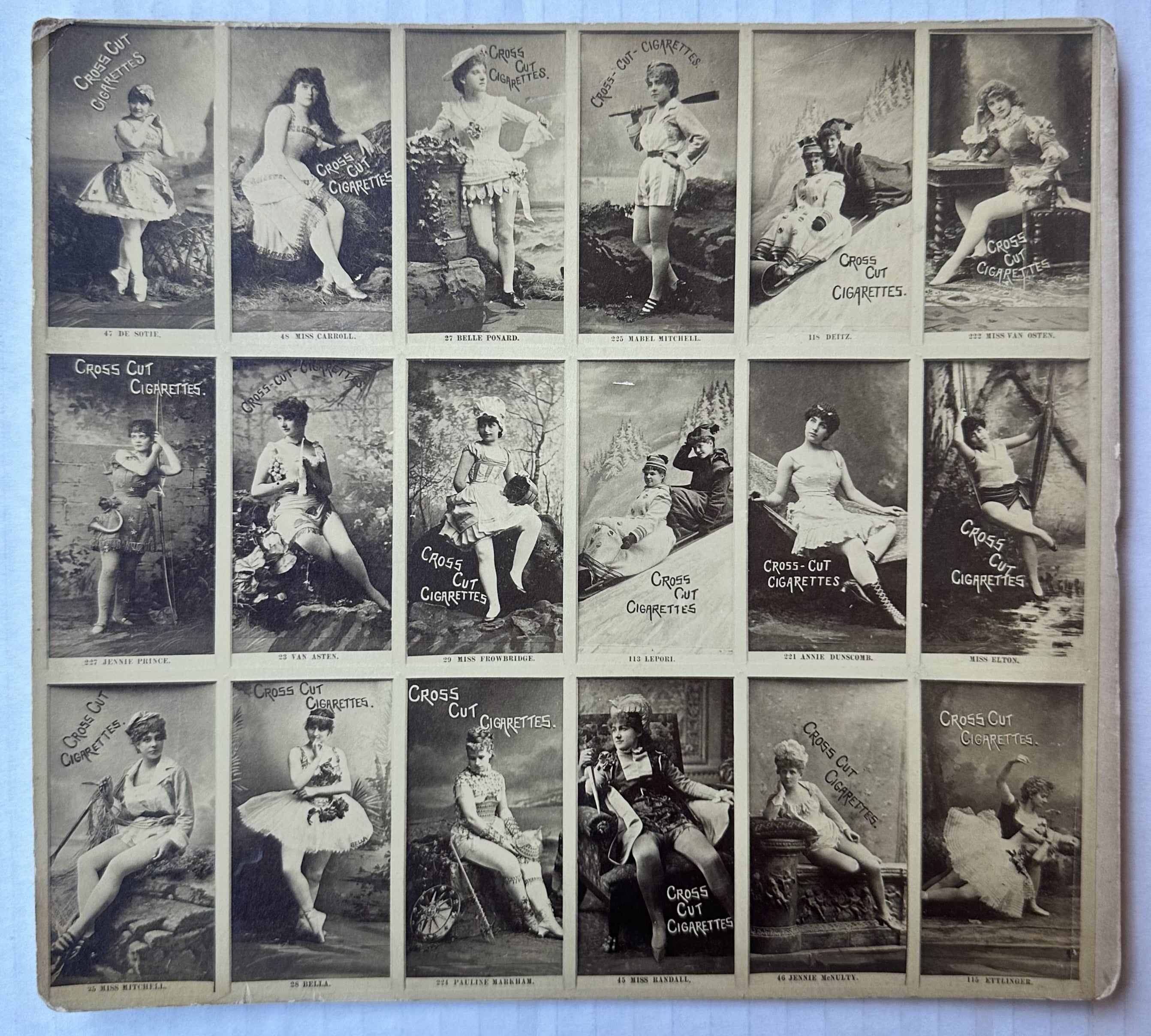 Collection of Cross-Cut Cigarettes advertising tobacco trade cards inserted into cigarette packets as a marketing tool by different cigarette companies, featuring popular stage actresses, dancers, and singers.