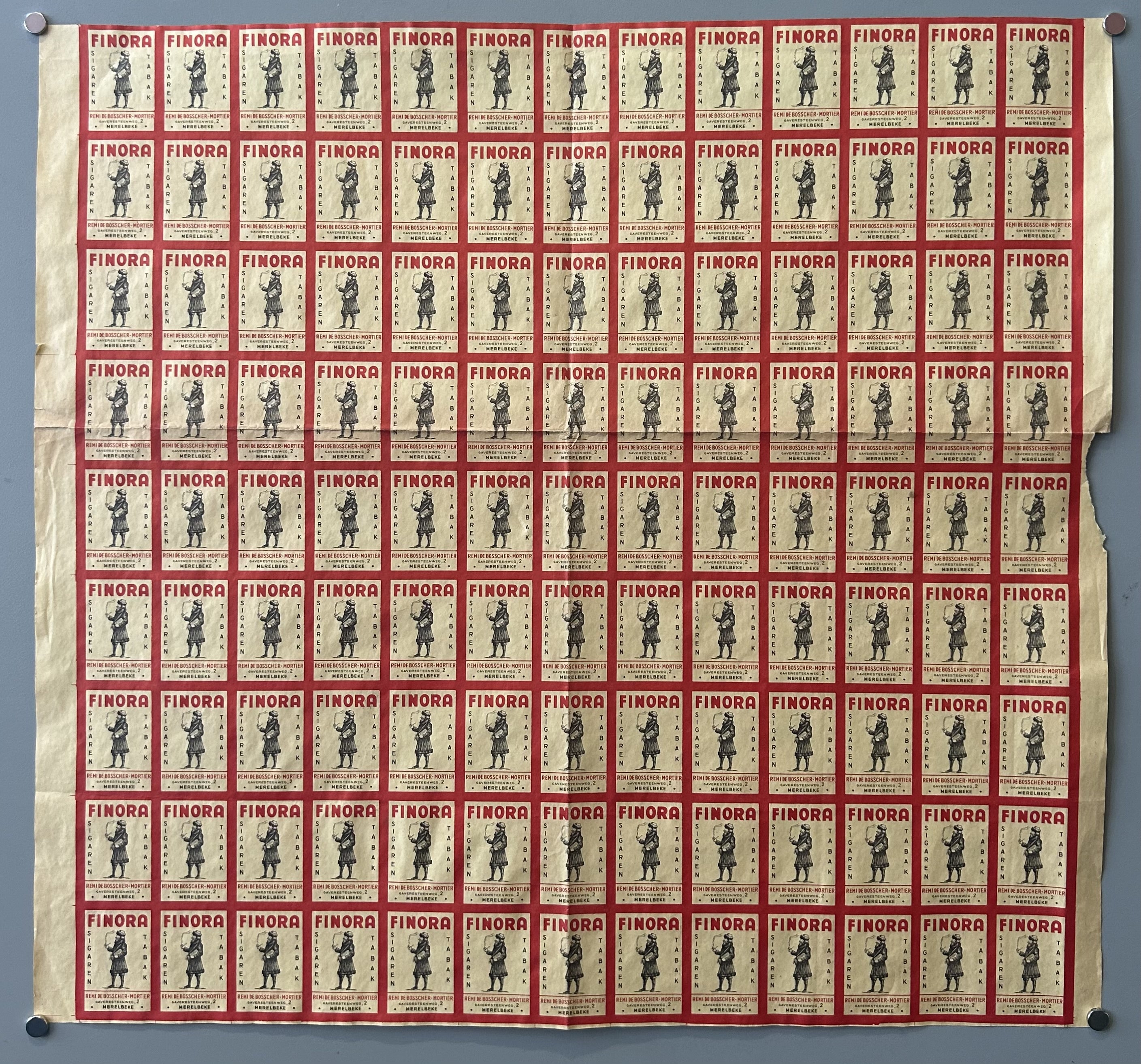 Match box cover poster showing graphics for a cigar company, reading Finora at the top and along the sides of each box, "Sigaren Tabak," or "tobacco cigars" in Dutch.
