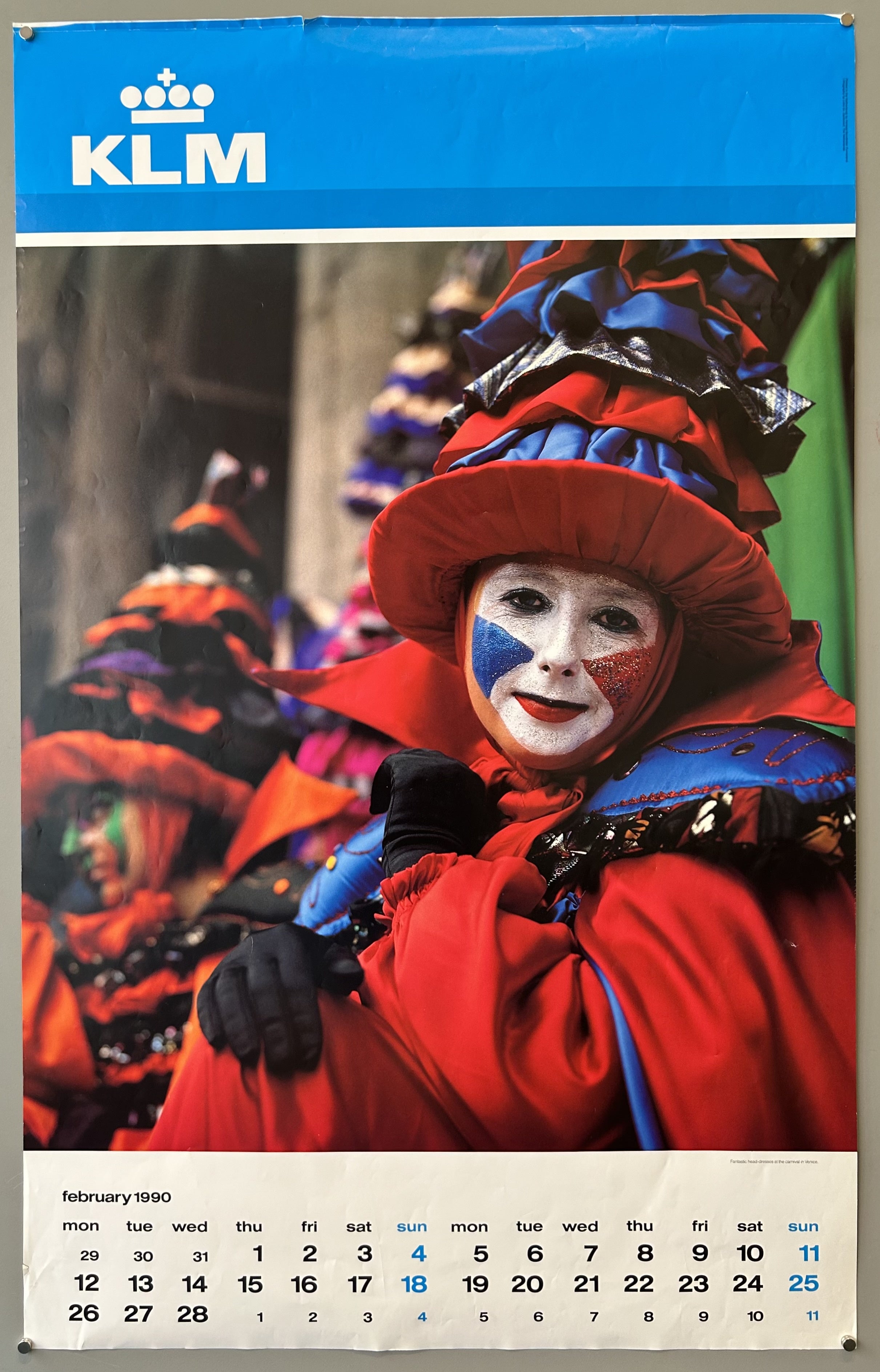 Published by KLM Royal Dutch Airlines, this is a page from a 1990 calendar showing the different destinations accessible utilizing the airline. All 12 of the posters from this series are available on our website.