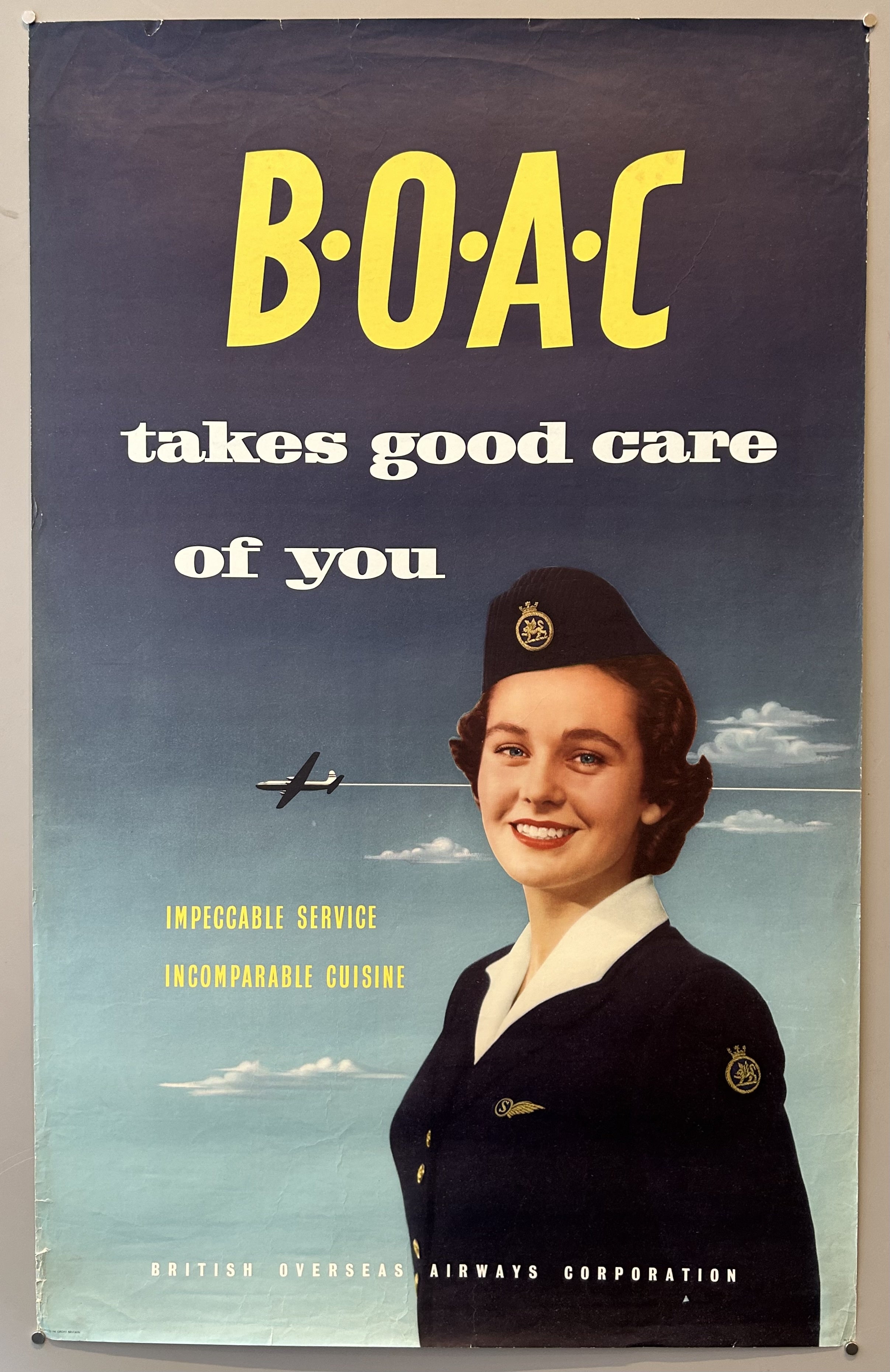Travel poster for British Overseas Airways Corporation (BOAC), which eventually became British Airways. A smiling flight attendant in uniform stands against a gradient sky background, a plane zooming by.