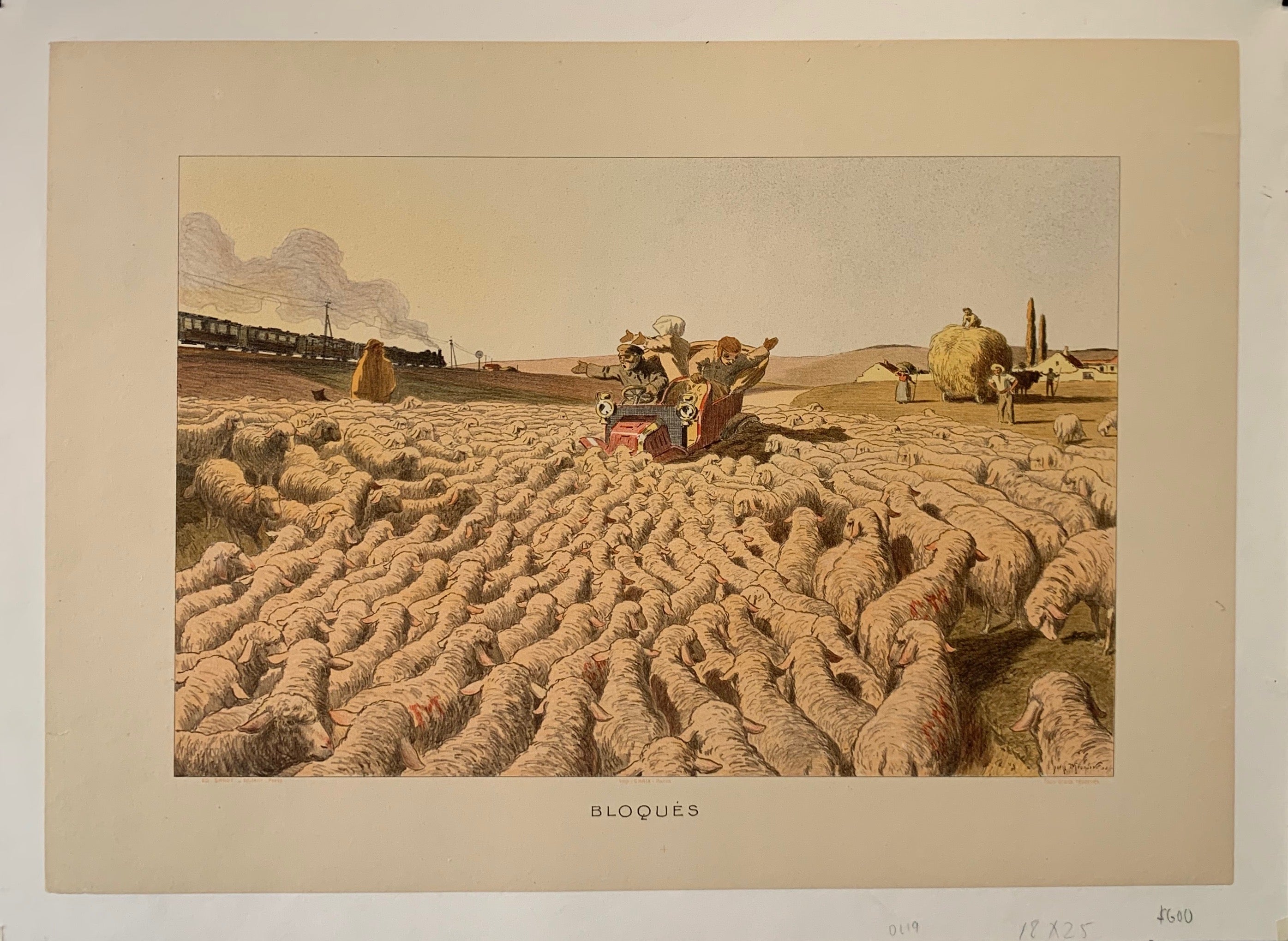 A vintage French poster of a car full of pasengers, comically attempting to drive through a flock of sheep. They do not seem to be making good progress.