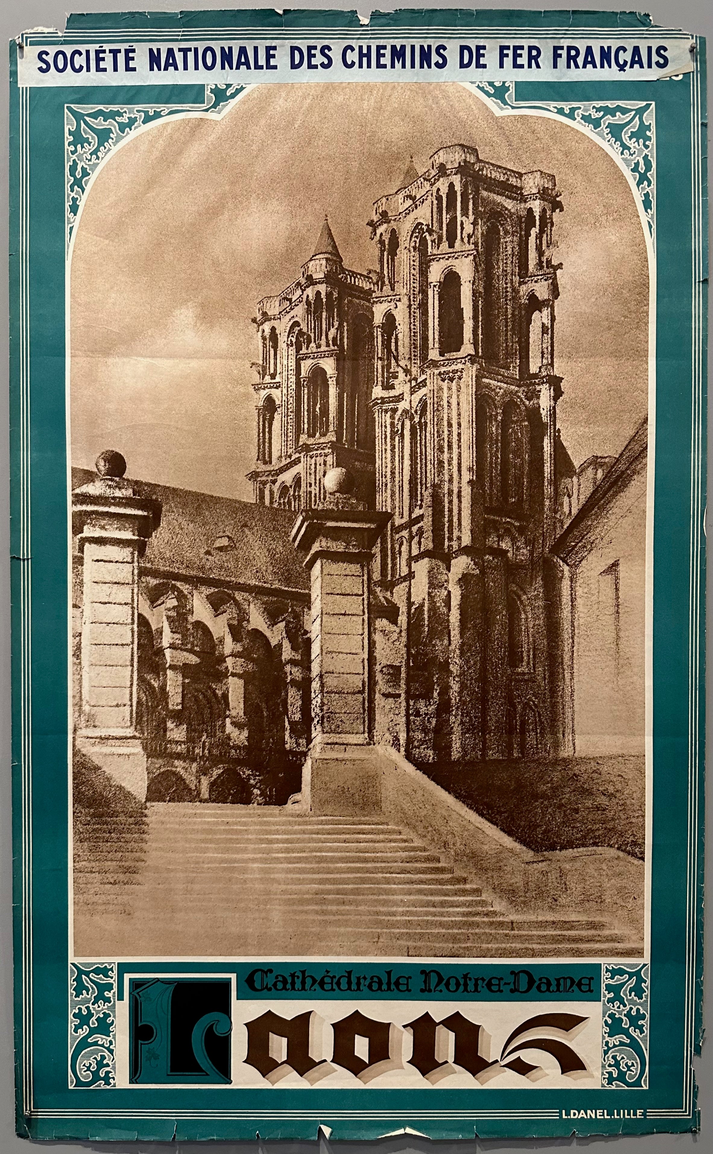 This poster promotes the Cathédrale Notre-Dame in Laon, Aisne, a 12th-13th century Roman Catholic Church. It served as the cathedral of the Diocese of Laon until 1802, and serves as a notable example of early Gothic architecture. Poster features a sepia-toned photo of the cathedral with a deep teal border. Banner pasted along top of poster.