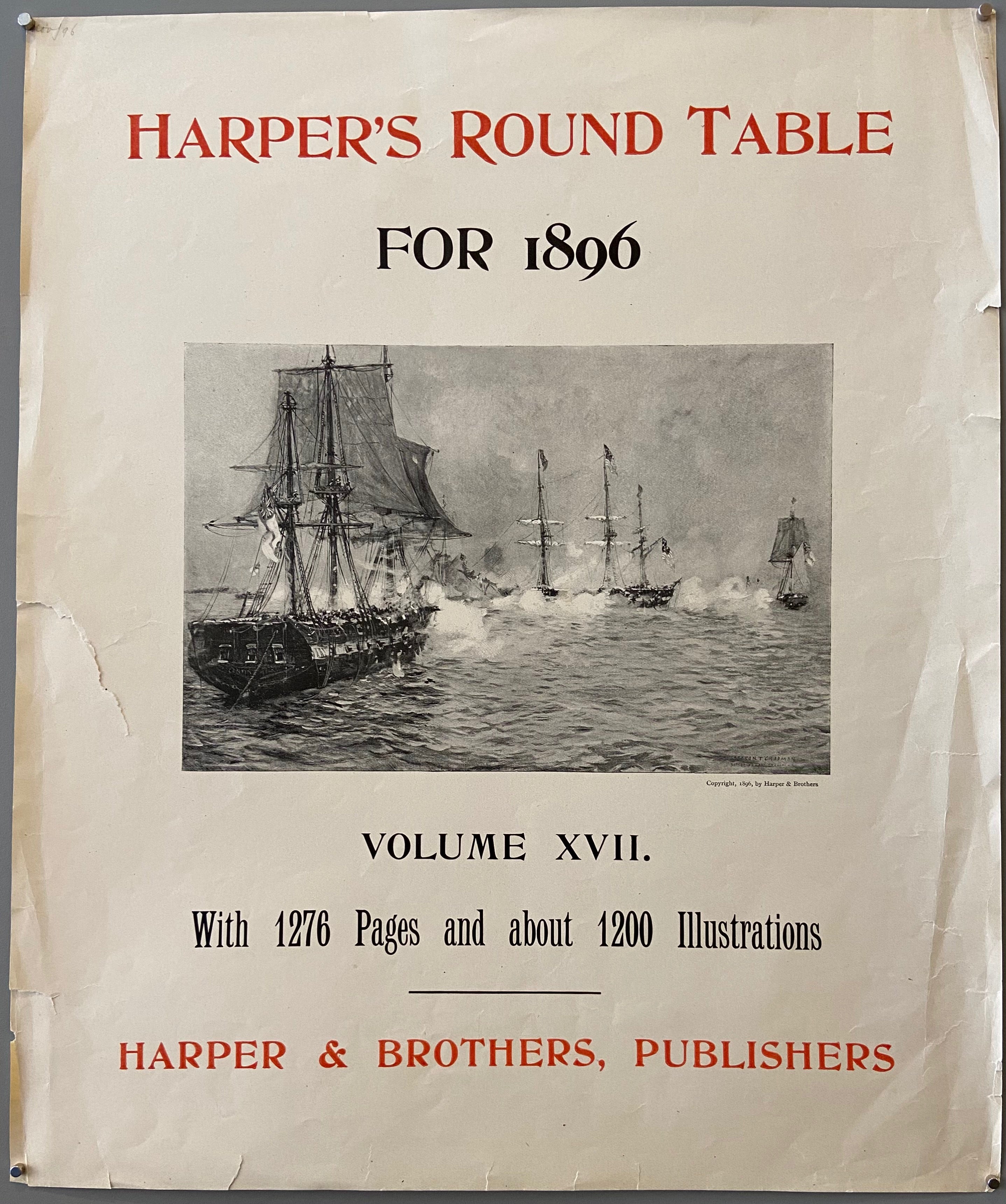 Original vintage poster for a publication featuring thousands of pages and illustrations. The advertisement features one such illustration, a beautifully detailed nautical scene.