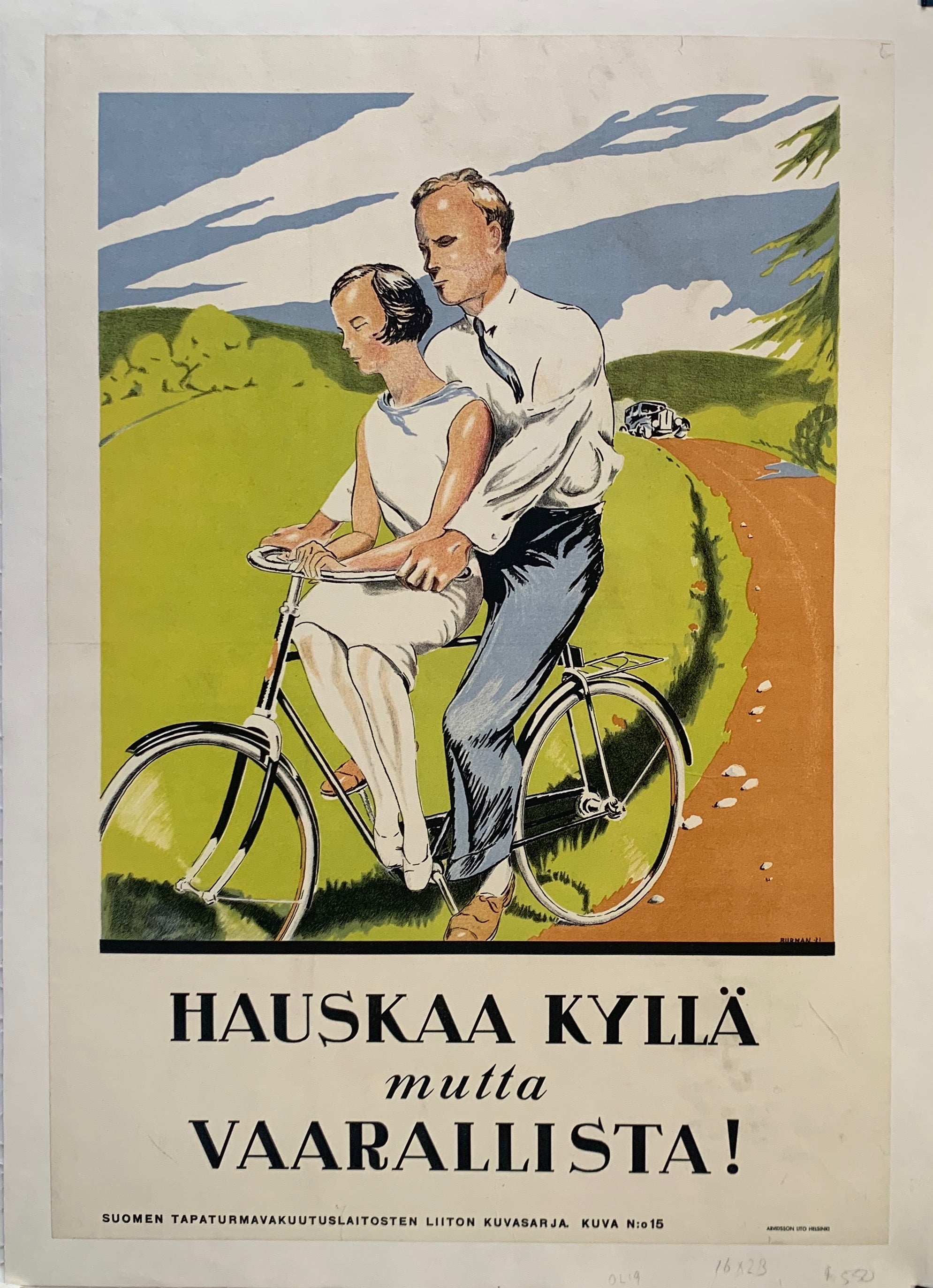 A vintage Finnish poster produced by the Finnish Association of Accident Insurance Institutions, intended to illustrate the pottential dangers of cycling. The tagline says "fun, yes, but dangerous!" The image on the poster shows a man cycling with his girlfriend sitting in front of him. The car driving behind them spells impending doom.