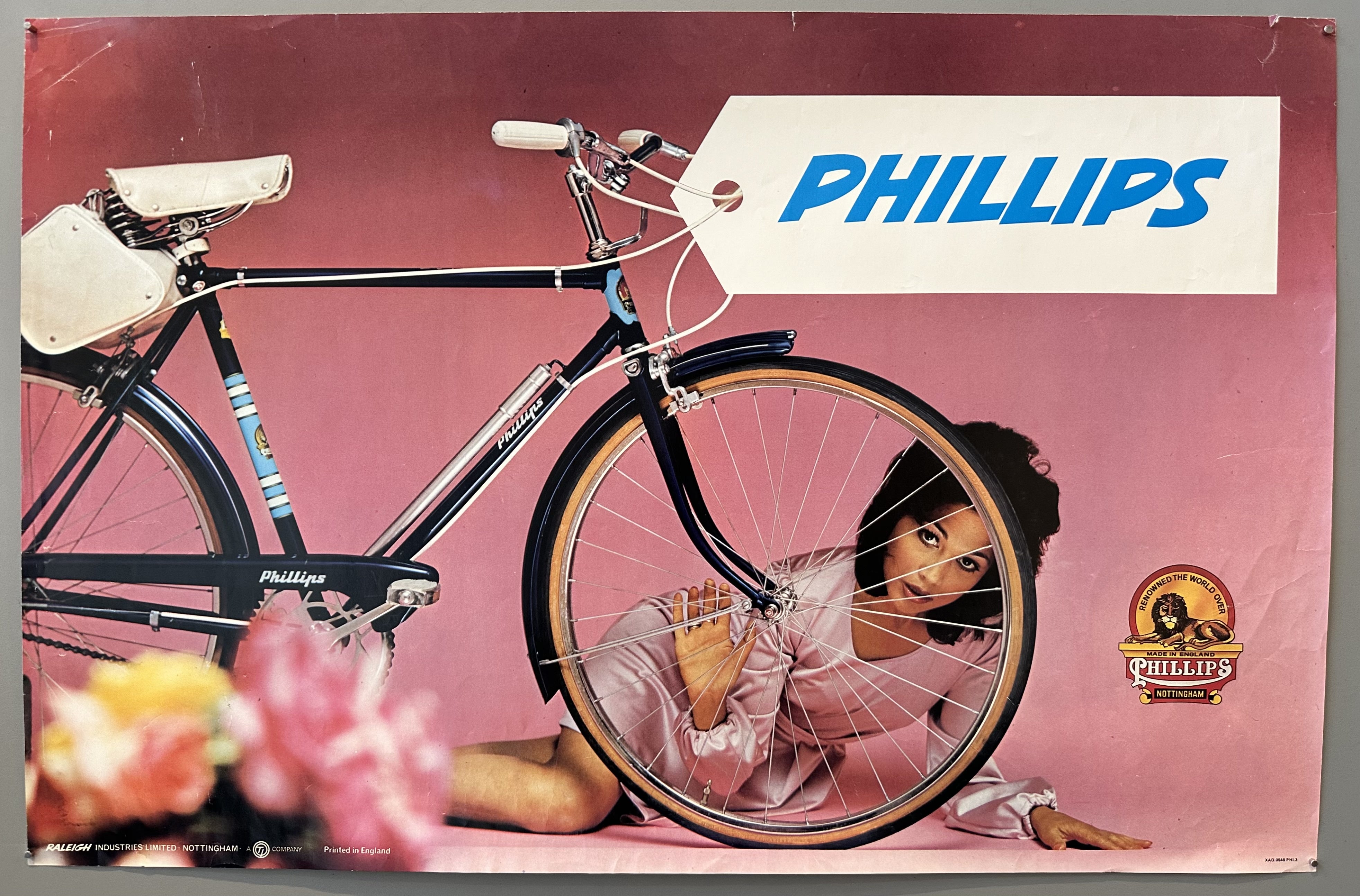 This stunning print advertises Phillips bicycles, showing a woman in a blush pink dress, against a blush pink background, with some blush pink flowers in the foreground.