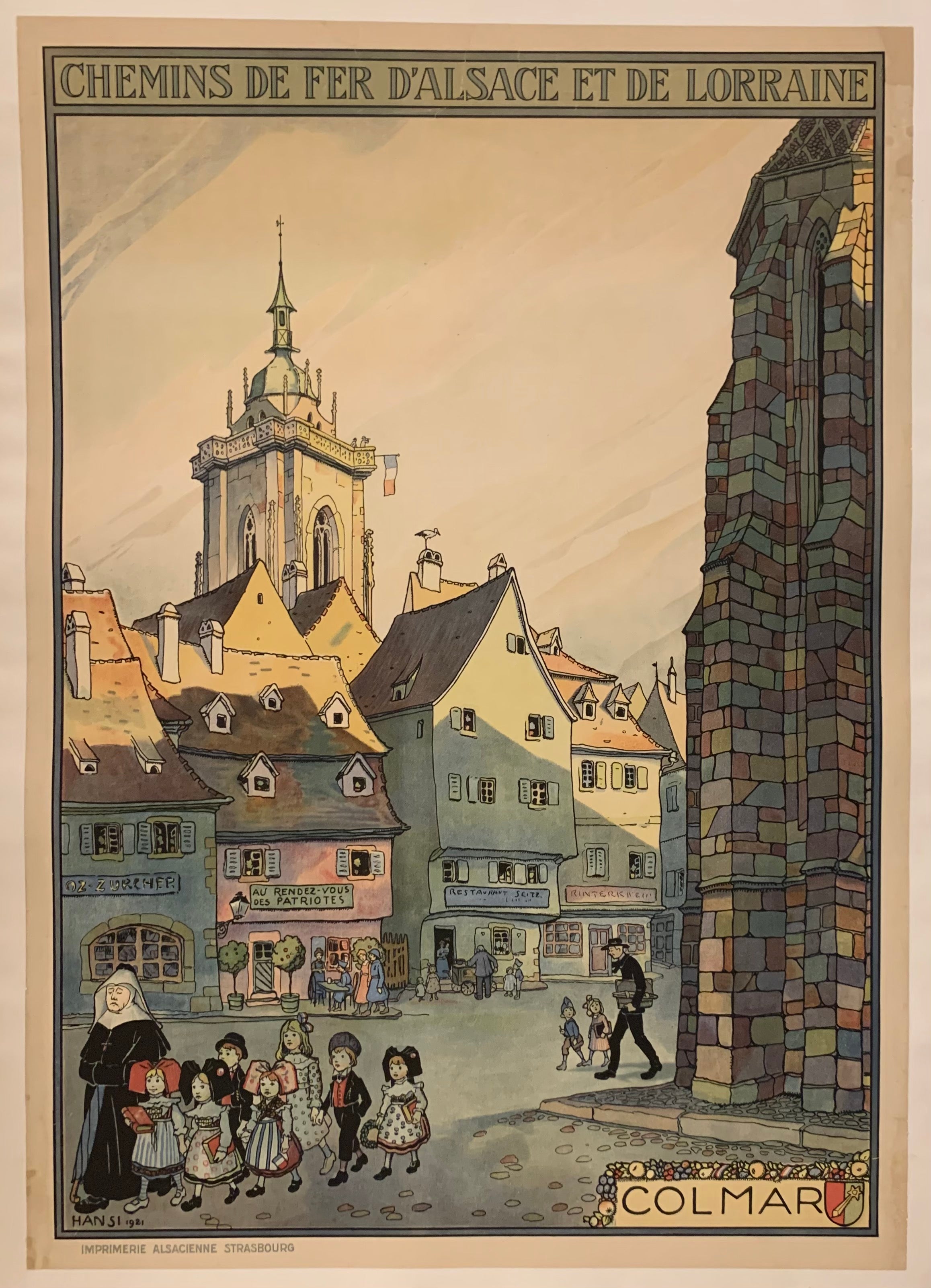 Vintage French travel poster for Colmar, a small village near France's border with Germany. The poster illustration is full of charming details and amusing figures: the nun leading the school children with a smug look on her face, the rainbow bricks on the buildings, and mix of French and German business signs in the background.