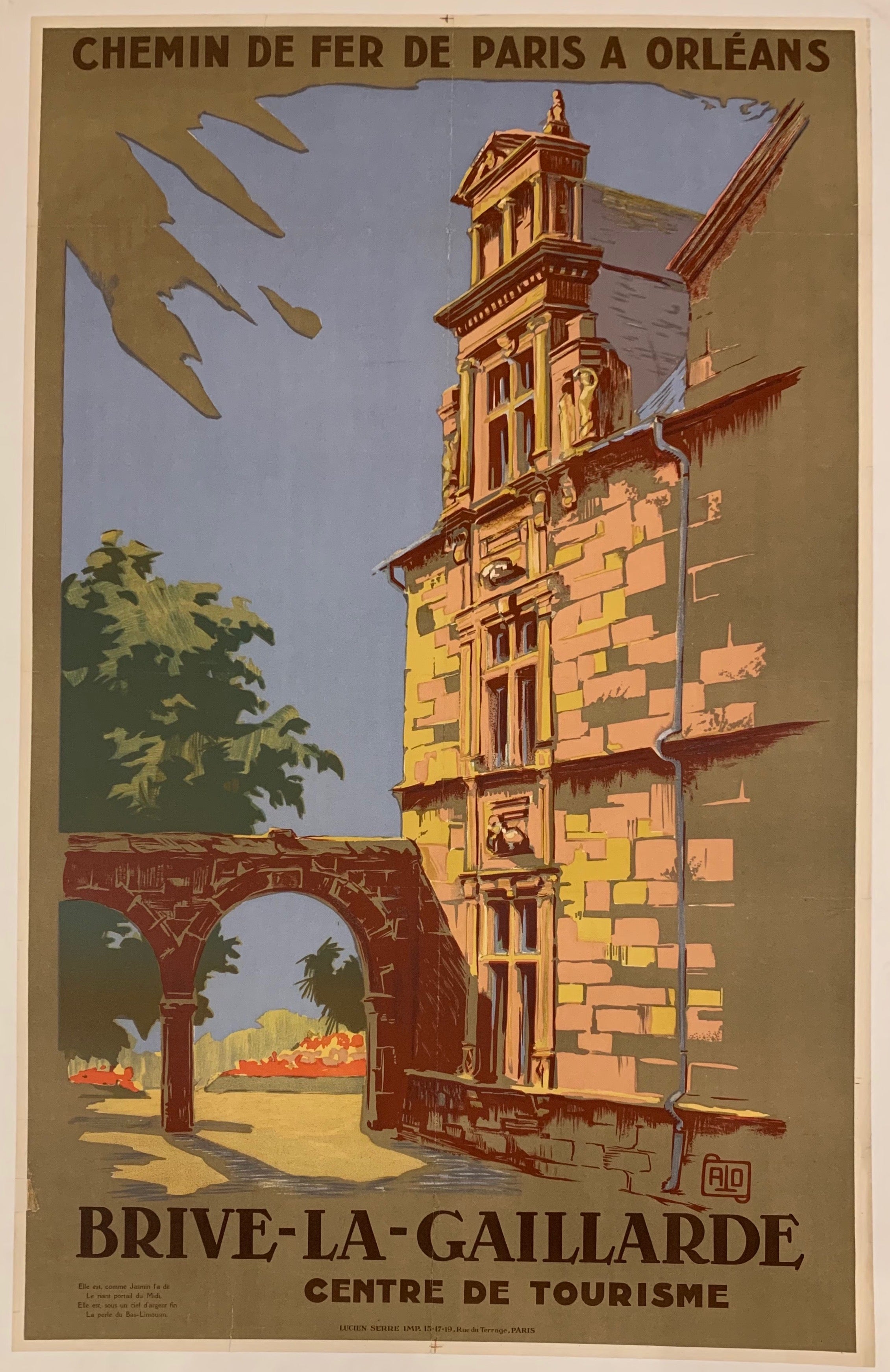 "Chemin de fer de Paris à Orléans, Brive-La-Gaillarde, Centre de Tourisme, Elle est, comme Jasmin l'a dit Le riant portail du Midi. Elle est, sous un ciel d'argent fin la perle du Bas-Limousin."