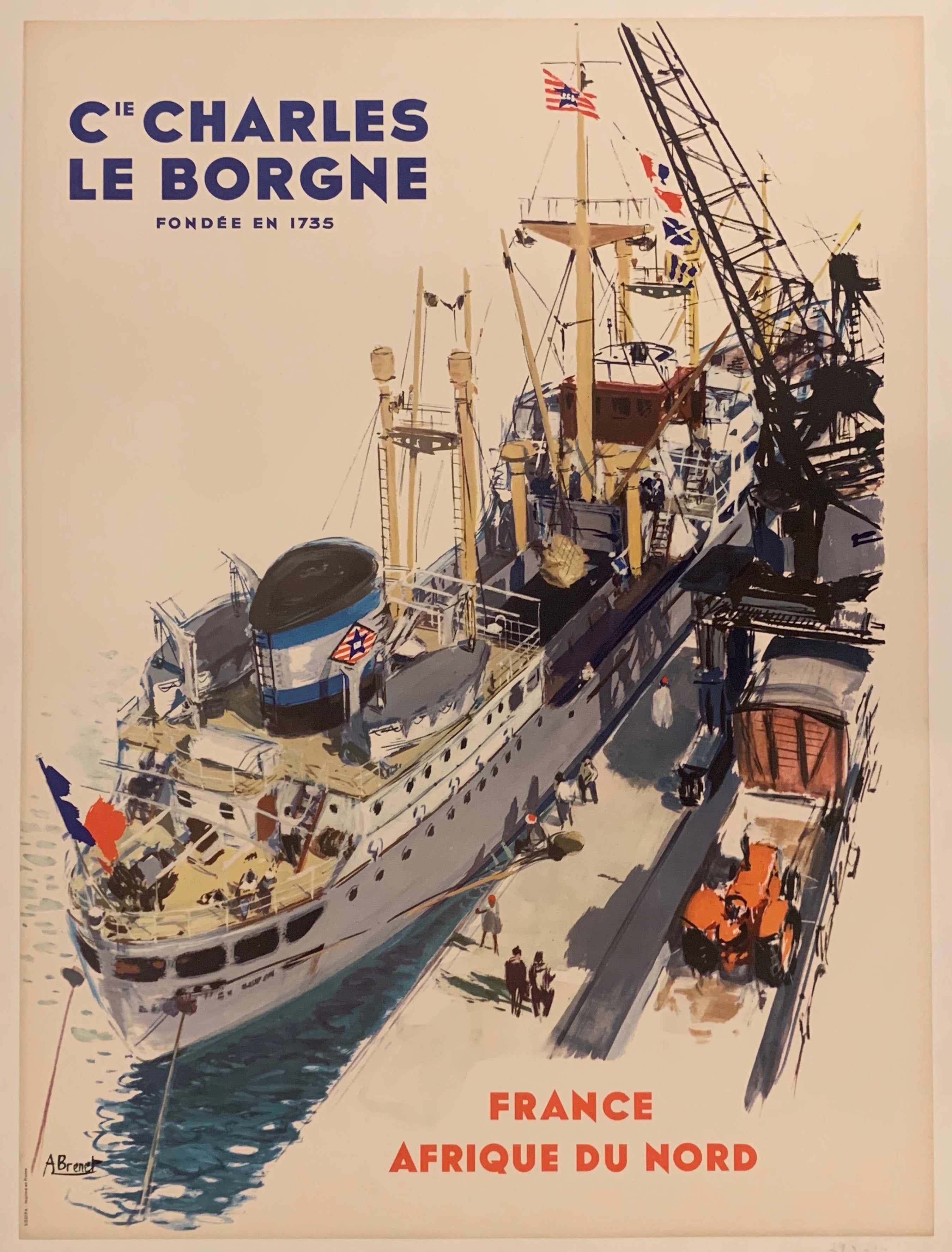 Vintage French poster for Charles le Borgne shipping and cruise lines. The poster features a snapshot of a bustling port, the massive ocean liner sketched in its full glory, no detail unaccounted for.