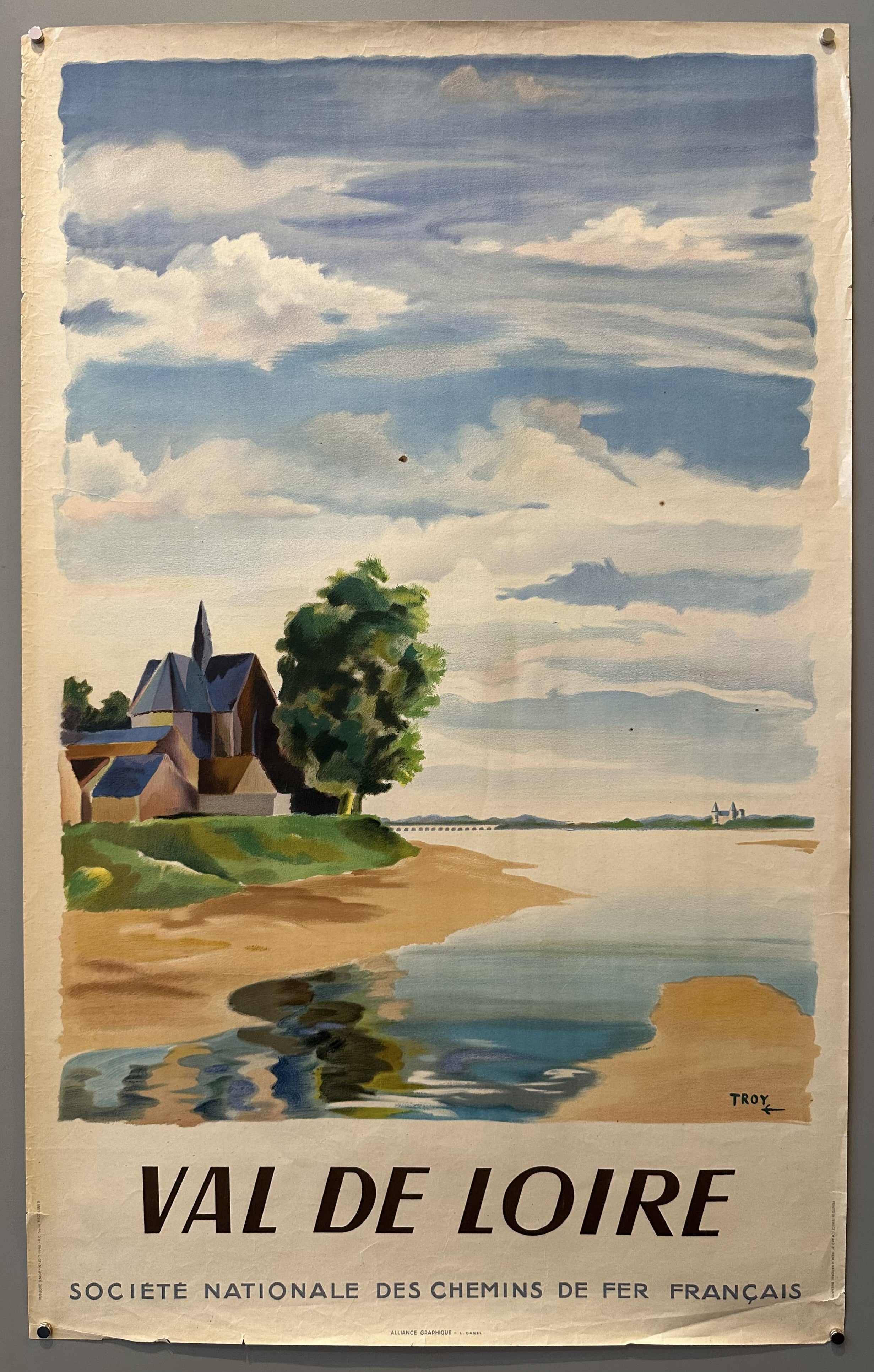 French travel poster published by and for the French government to promote tourism. Advertising the Val de Loire region, featuring the Loire River in central France.