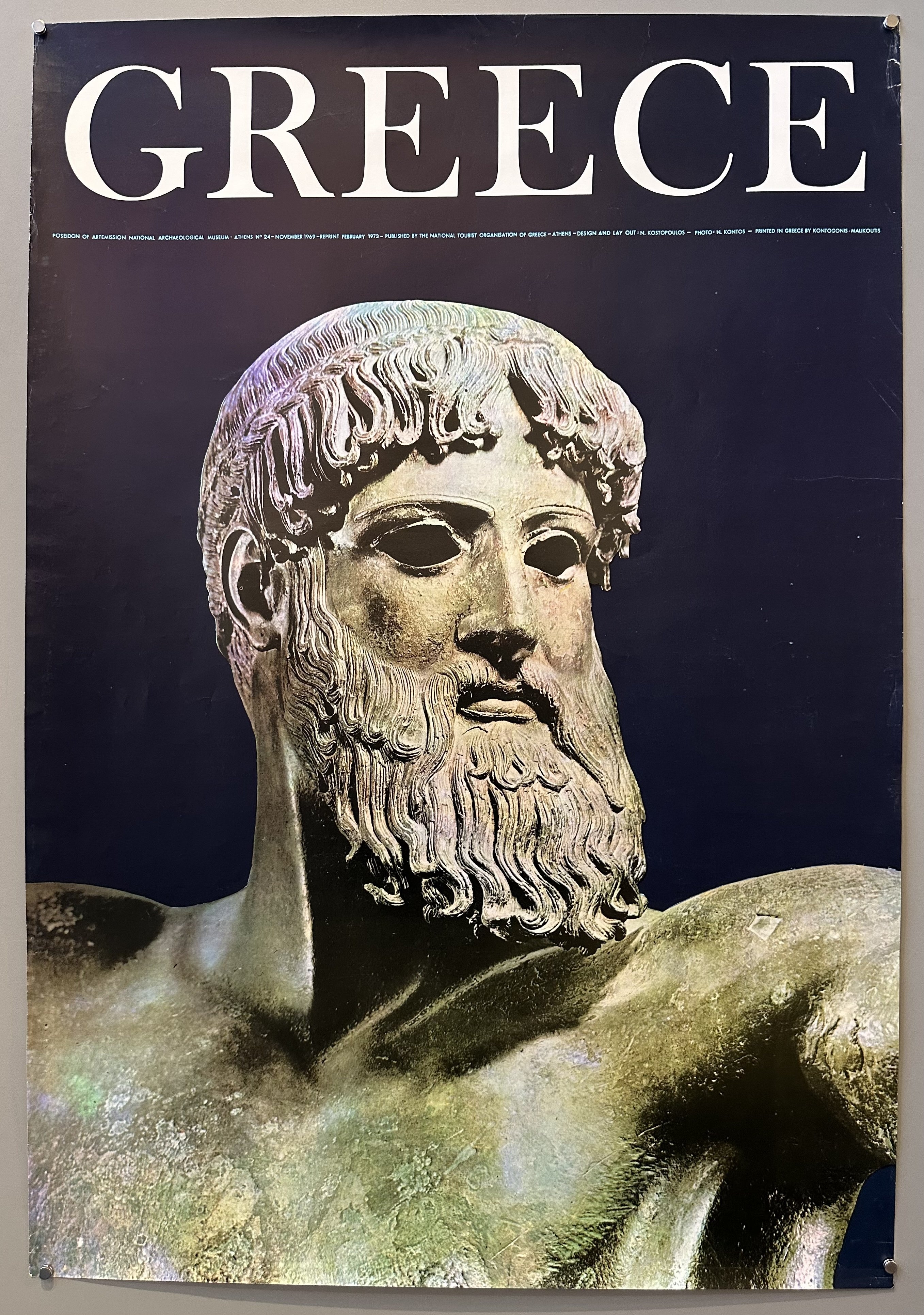 A poster promoting travel to Greece that features a close-up of a sculpture of Poseidon. This was originally printed in 1969 with this reprint being issued in 1973.