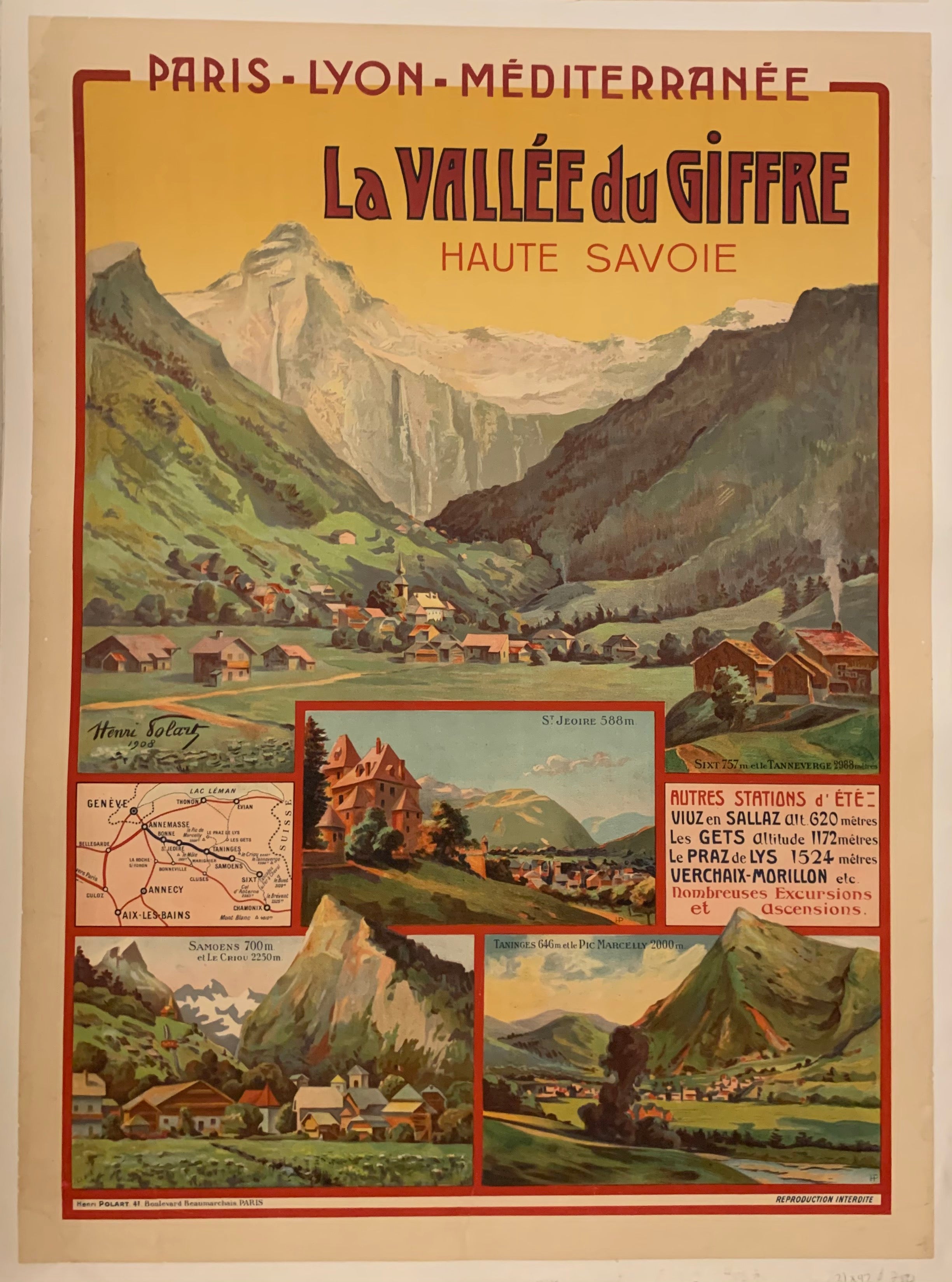 Vintage French travel poster for the Giffre Valley in Haute Savoie, home to many sleepy little towns nestled within the Alps. Illustrated on the poster are richly colored images of the St. Jeoire, Samoens, Taninges, and Sixt vilages.