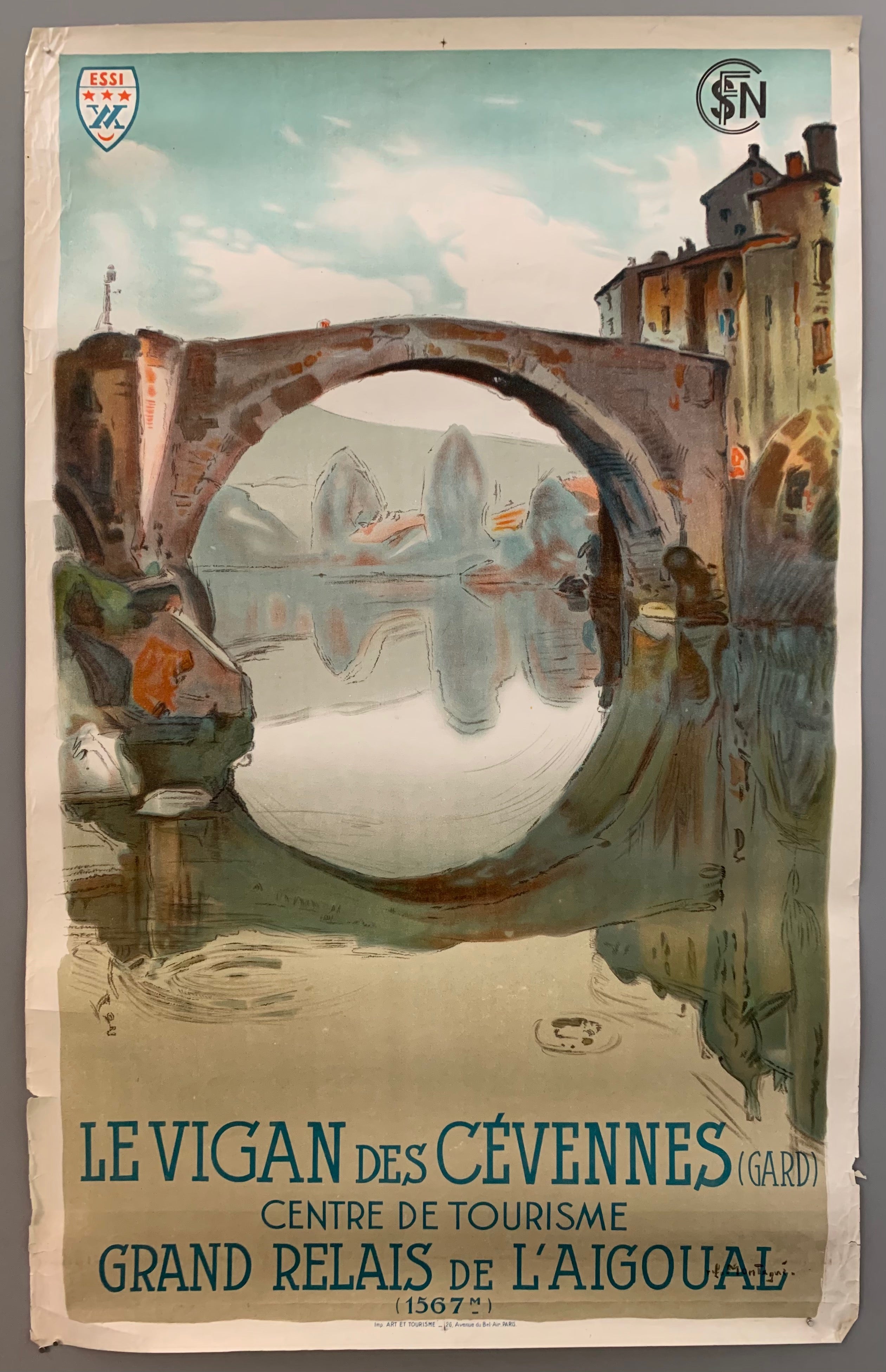 This lovely original travel poster shows a watercolor-esque scene of a quaint village called le Vigan, a commune in the Gard region of Southern France. The mountains of Cevennes get a feature here, advertising a relay that takes place on Mont Aigoual. This is an absolutely lovely scene, the old stone bridge reflecting over the river, leading to a medieval town. This design was famous and used initially about 10 years before this poster.