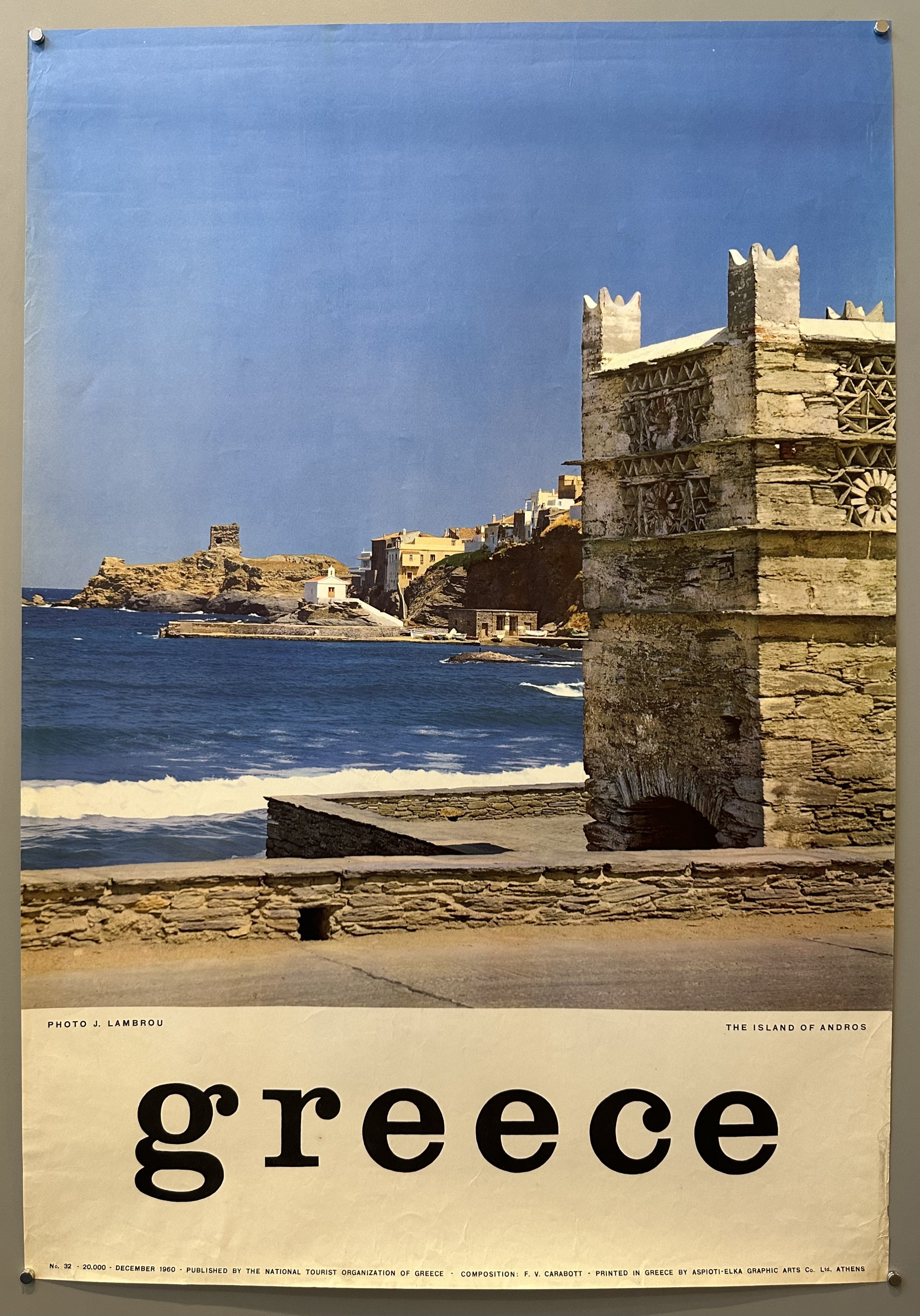 A vintage Greek travel poster featuring a photograph of the Island of Andros from December 1960.
